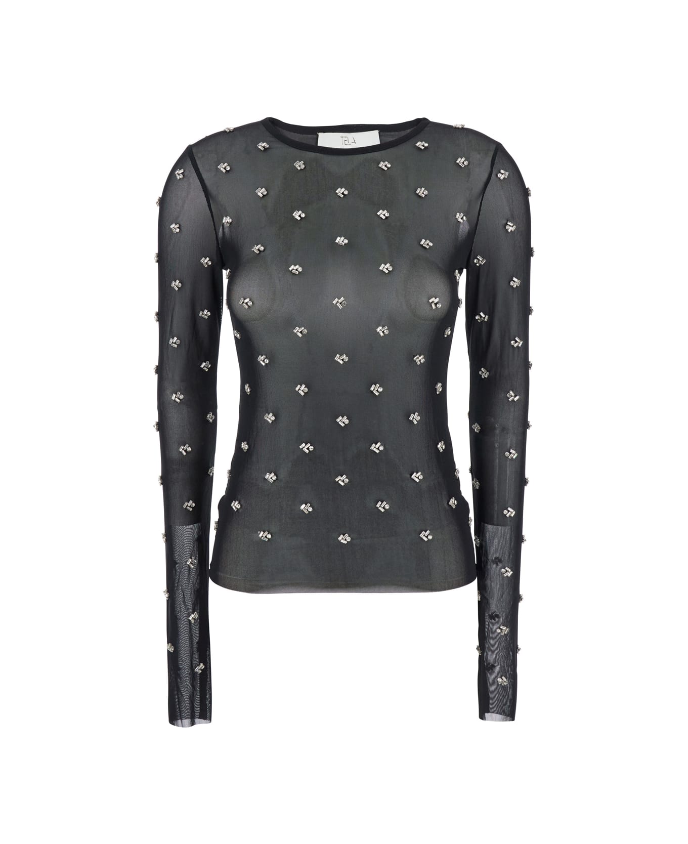 Top Black Crewneck Long sleeves Straight hem Embellishments on front and sleeves Semi sheer design Tech fabric Regular fit