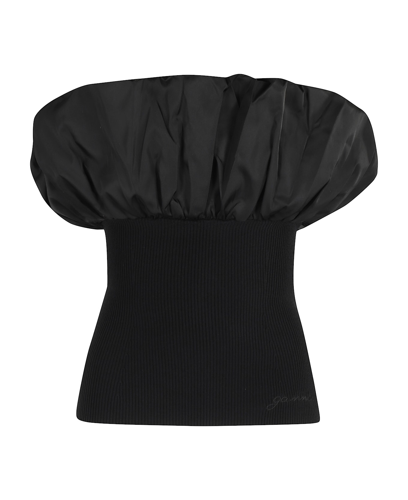 Top - Ganni - Black color - Melange knit pattern - Boat neckline - Bare shoulders - Bolted - Ruched detail on neckline - Back zipper closure