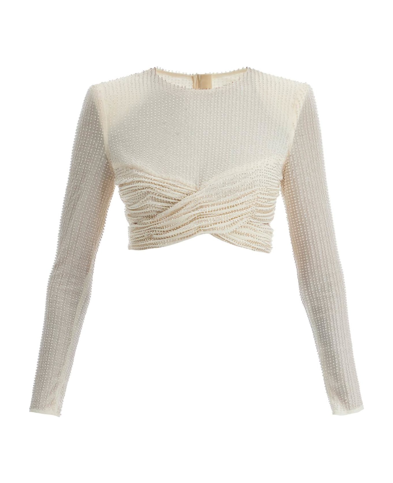 This long-sleeved crop top by Self-Portrait is made of mesh and entirely covered in beads. It has a fitted silhouette with removable straps and a criss-crossed, draped design on the front. The back features a zip closure. The model is 177 cm tall and wears a UK size 6.