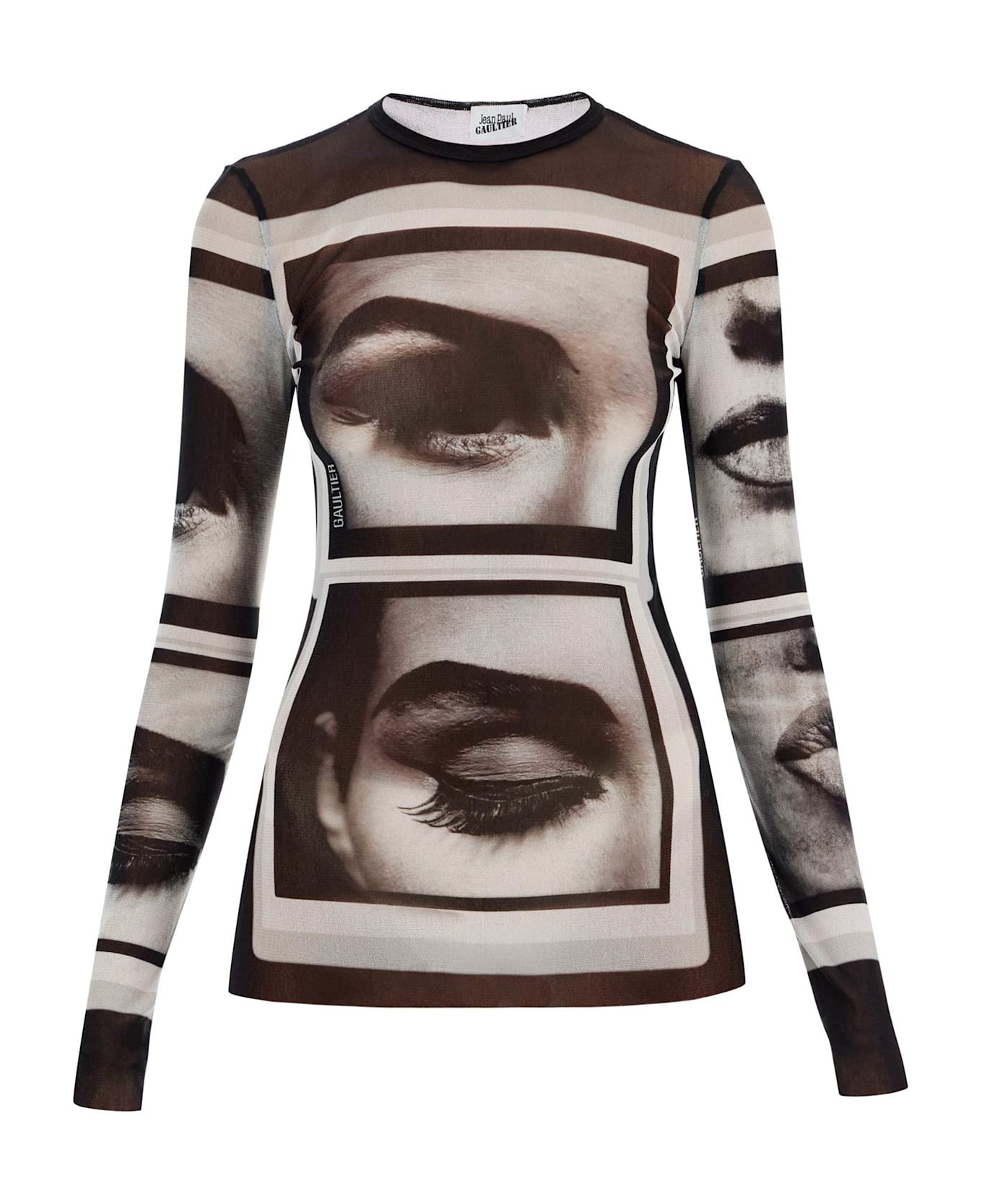 This long-sleeved top from Jean Paul Gaultier features a fitted silhouette and a round neckline, adorned with an all-over 'Eyes and Lips' print. Made of semi-transparent mesh, it is finished with raw edges on the cuffs and hem. The model is 177 cm tall and wears size S.