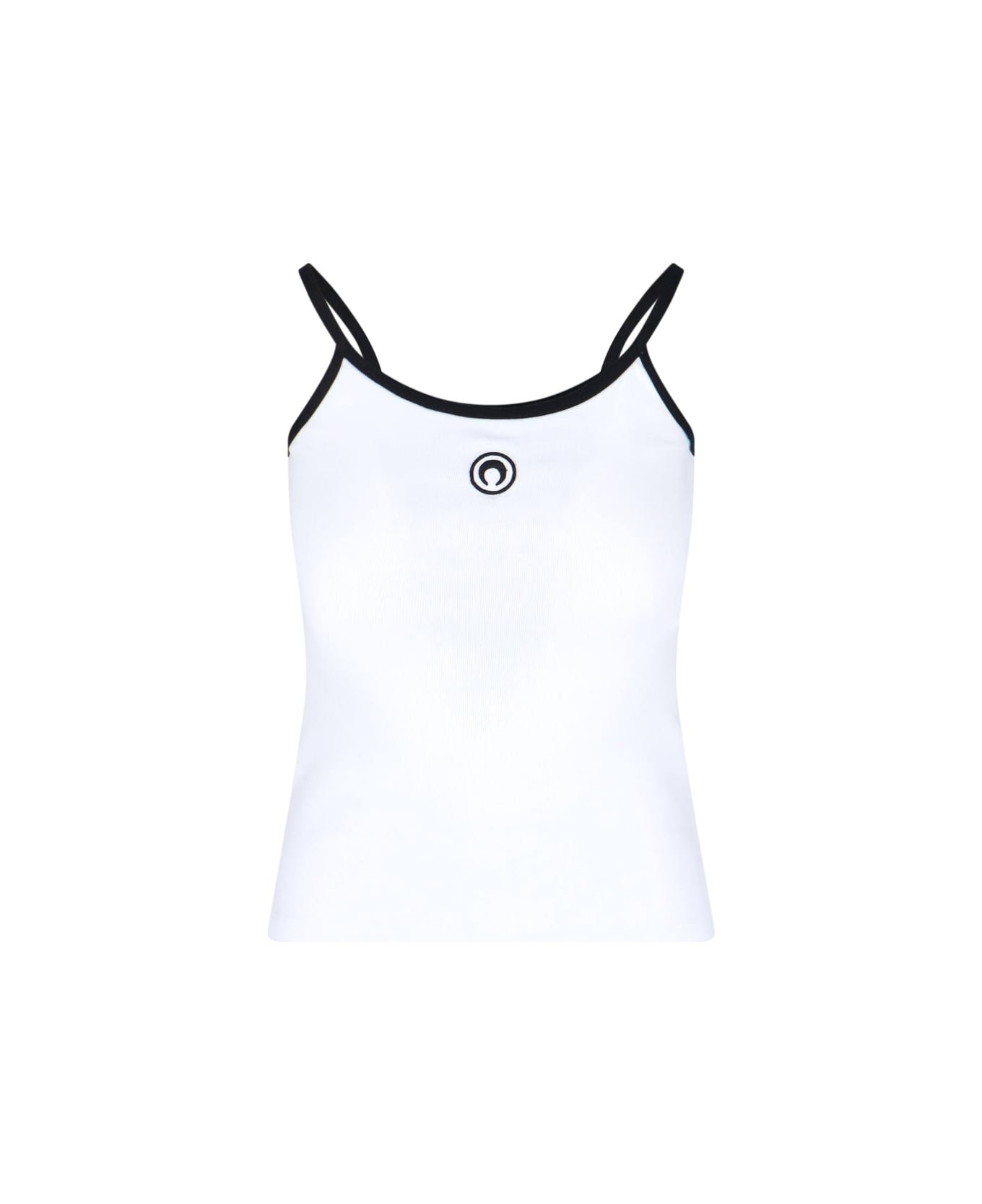 Marine Serre 'Moon' logo tank top in white cotton with contrast trim, ribbed pattern, round neckline, thin straps, contrasting chest logo embroidery, back logo label, straight hem. Composition: 100% Cotton