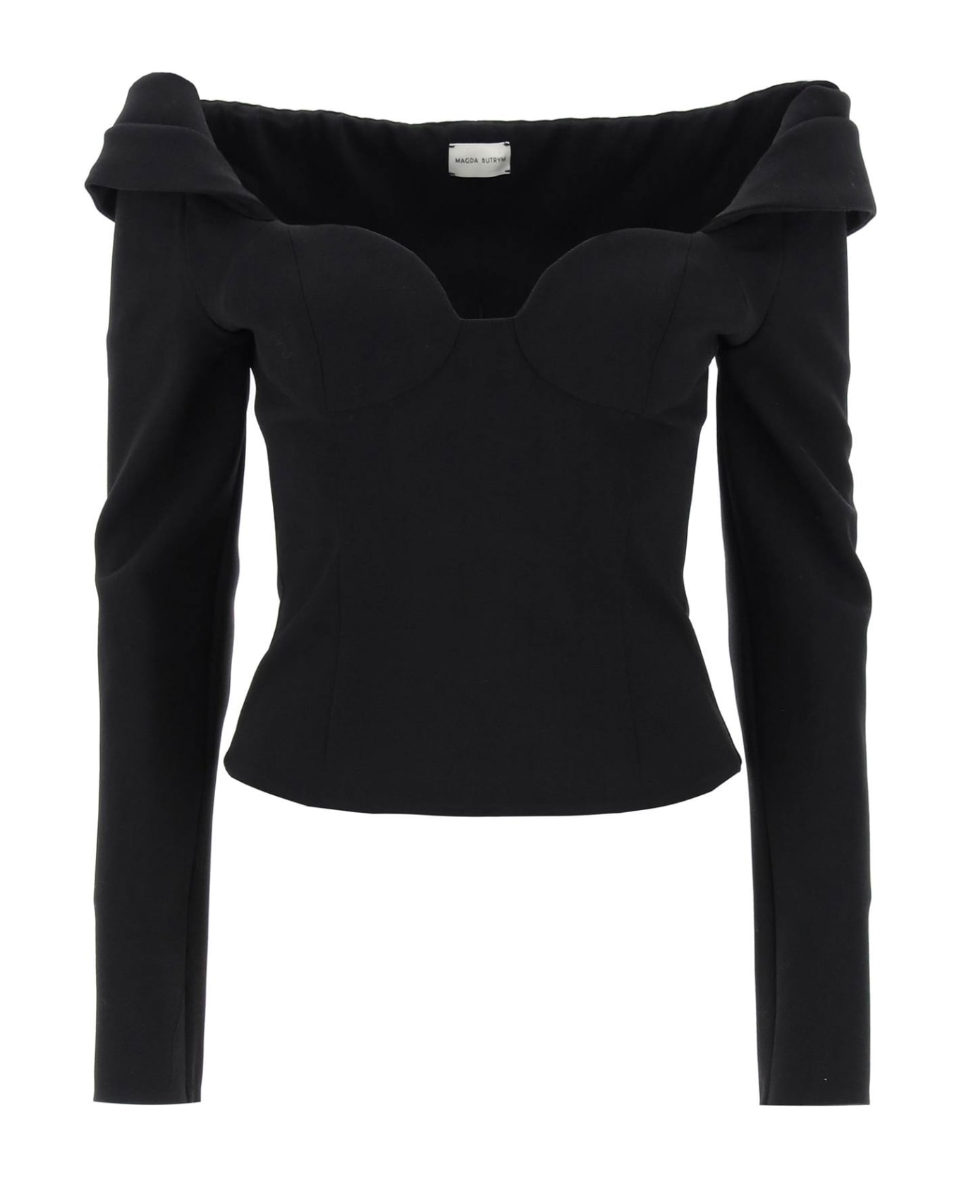 Magda Butrym long-sleeved top boasting a wide off-the-shoulder neckline with rounded bustier cups and draped detailing. It is made of stretch wool crepe and closed at the back with an invisible zip. The model is 177 cm tall and wears a size FR 36. Composition: 96%WO, 4%EA