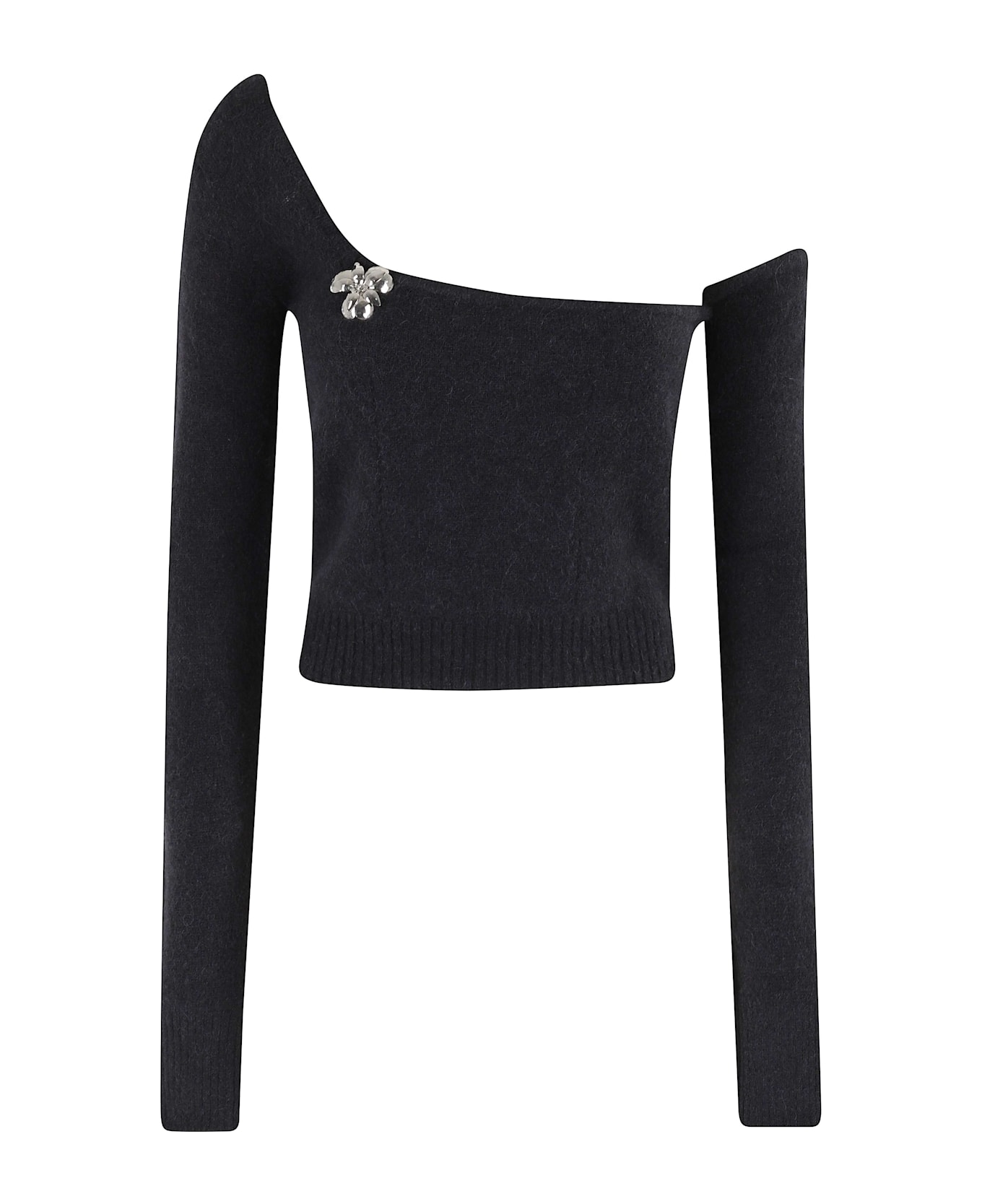 Sweater - Blumarine - One shoulder model - Black color - One shoulder with removable sleeve - Long sleeves - Short - Silver flower applique on front
