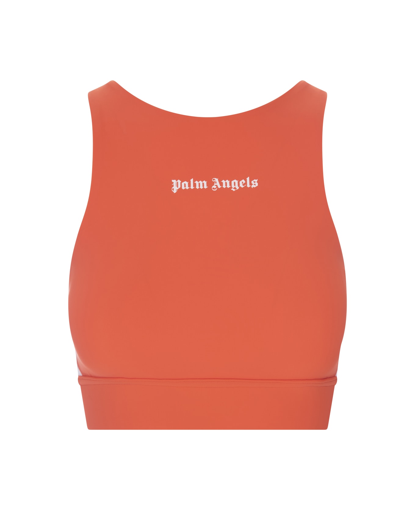 Orange sports top by Palm Angels made of stretch technical fabric and characterized by a round-neck, sleeveless design, black and white side stripes and white Palm Angels logo printed on the front. Composition: 72% Polyamide
