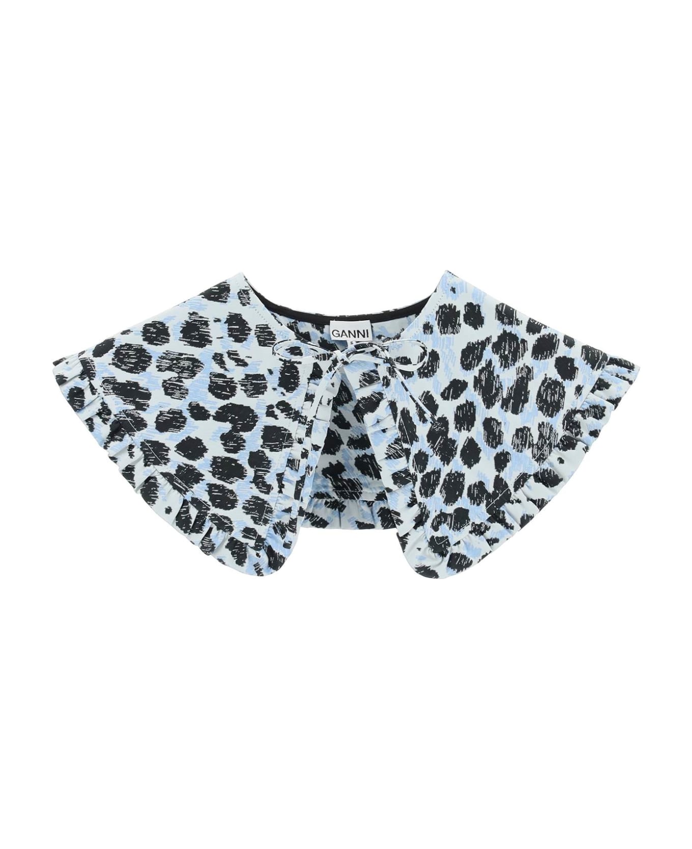 Ganni detachable collar in leopard-printed eco-sustainable cotton. Oversized design with ruffled edge. Closure with ties. The model is 177 cm tall and wears a size OS. Composition: 100% cotone biologico