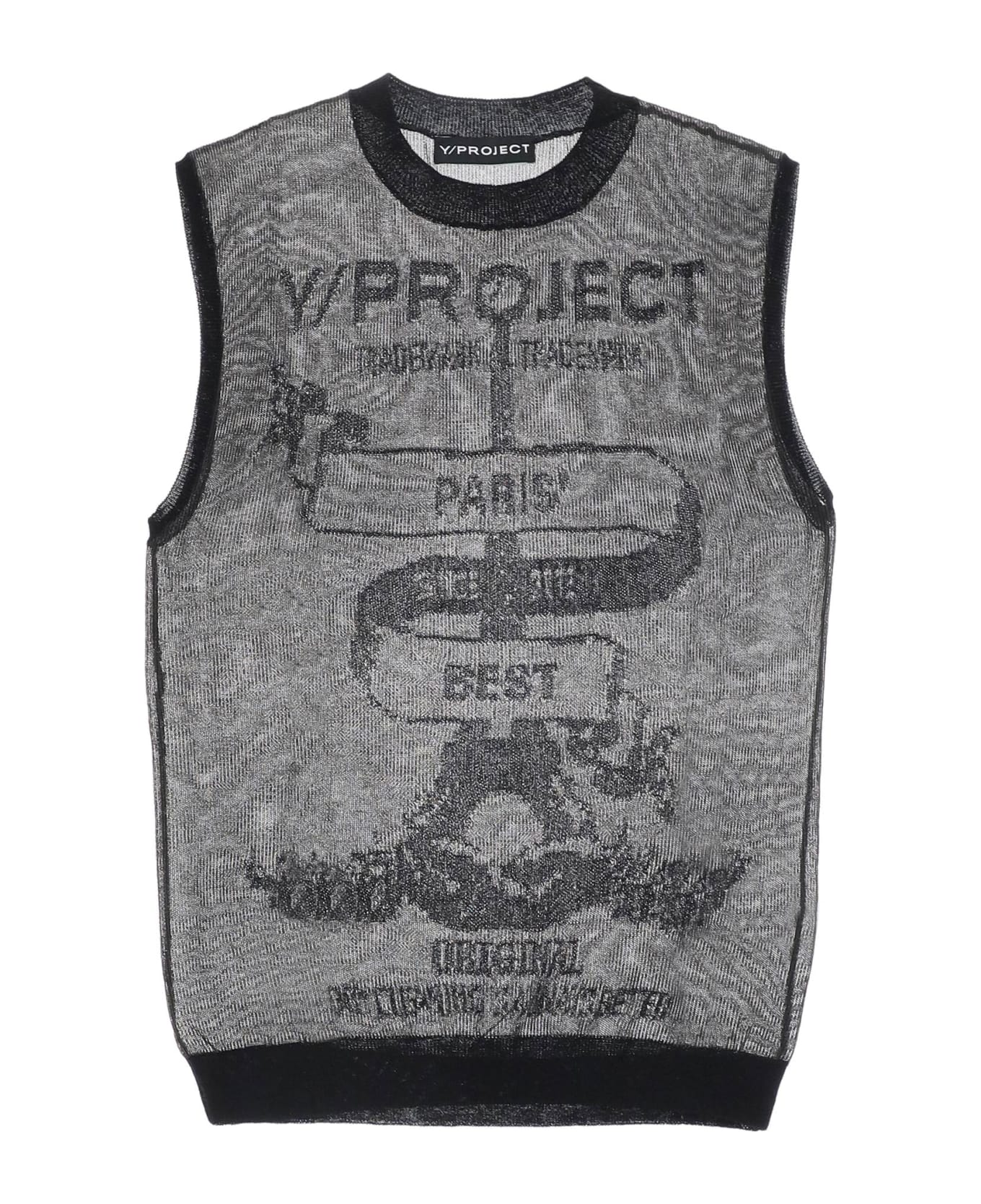 The Y-Project vest is made of transparent cotton blend knit, decorated with an inlaid Paris logo on the front. It features a crew neck and ribbed edges, with a relaxed fit. The model is 187 cm tall and wears size M.