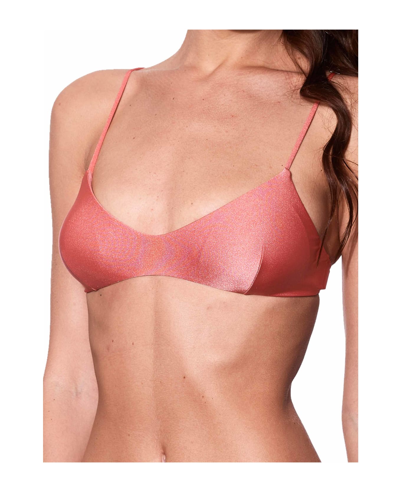 Shiny peach bralette Adjustable straps on the shoulders Open on the back Removable padded cups Stretch fit Regular fit Composition: 90% Polyamide 10% Elastane