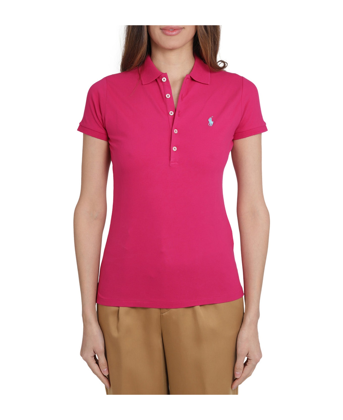 Fuchsia polo shirt in stretch cotton mesh. Signature light blue polo horse logo embroidery. Point collar. Short sleeves. Five-button fastening. Side slits. Slim fit. Model is wearing size S. 97% cotton, 3% elastane Made in Turkey Designer colour: ARUBA PINK