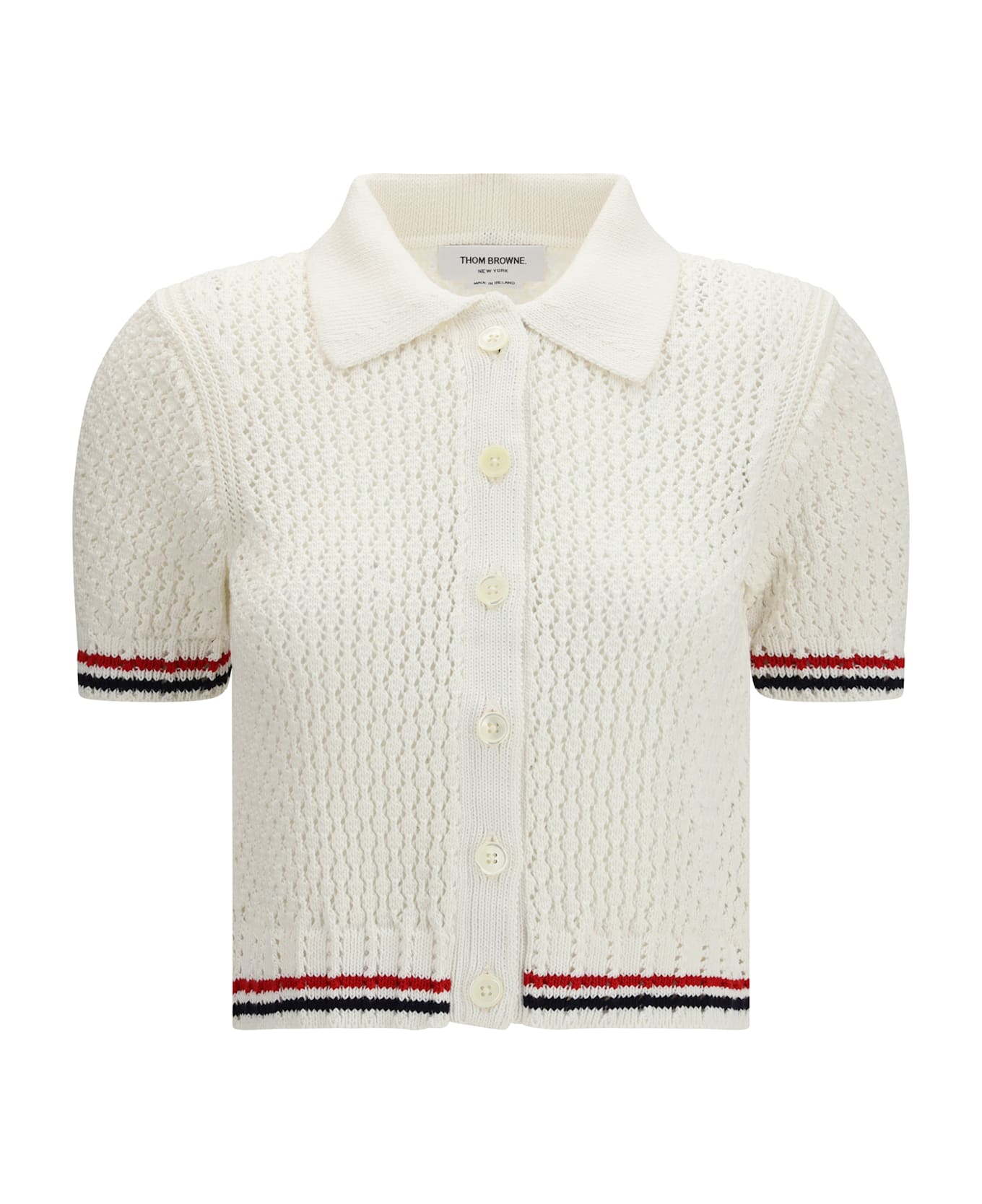 The hector pointelle short-sleeve cardigan by thom browne is crafted from breathable cotton knit in a pointelle stitch, offering lightness and comfort for warm weather. designed with a ribbed polo collar, front button closure, and signature details including the rwb grosgrain placket, ribbed cuffs and hem with tricolor tipping, and buttoned side vents, it features a tonal hector intarsia at the back celebrating ten years of the brand s iconic dachshund. the look is finished with the signature striped grosgrain loop tab for an unmistakable thom browne touch.