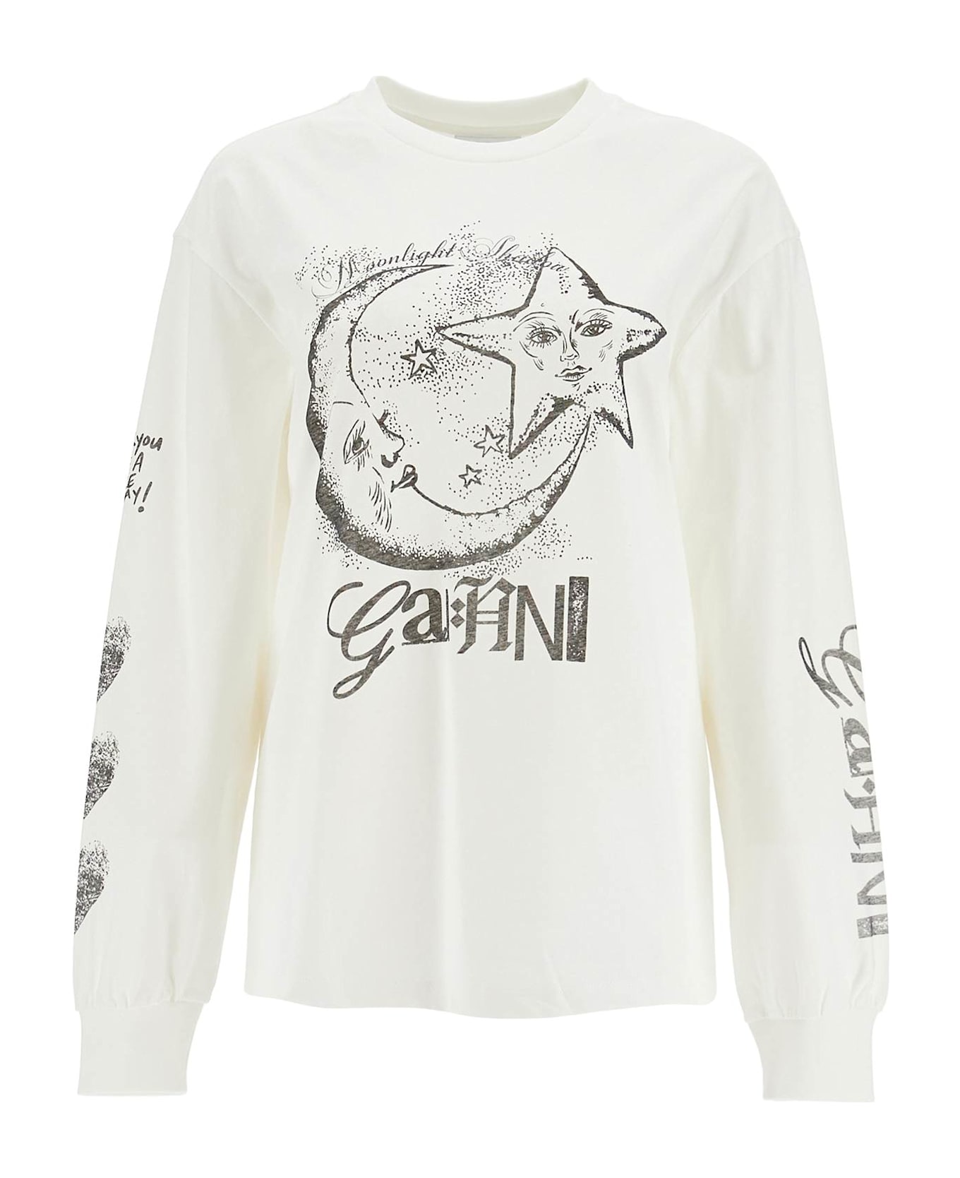 This Ganni long-sleeved t-shirt is made of organic and recycled cotton jersey with graphic print on the front, back, and sleeves. It features a crew neck and micro ribbed edges, as well as a relaxed fit. The model is 177 cm tall and wears size XS. Composition: 50% organic CO, 50% REC CO