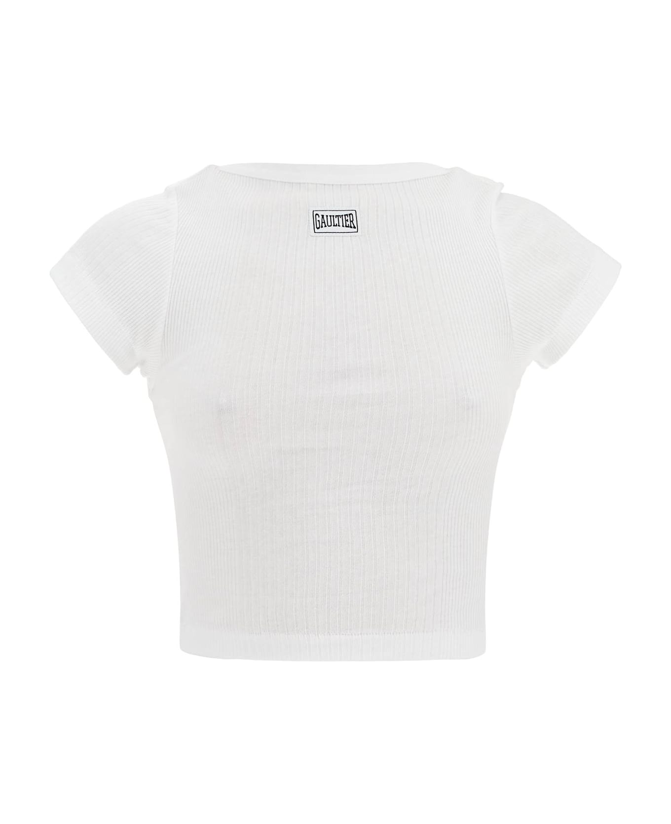The Gaultier crop t-shirt embodies high summer fashion. In white cotton with logo, it offers elegance and comfort. Slim fit and versatile, it elevates every look with cutting-edge style and timeless refinement.