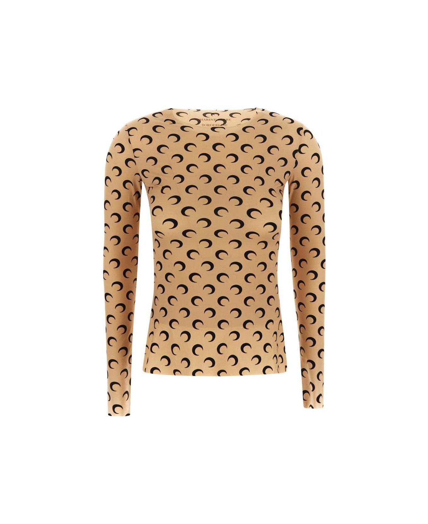Marine Serre crew neck top in tan polyamide with all-over black moon motif, long sleeves and raw cut on the hems.