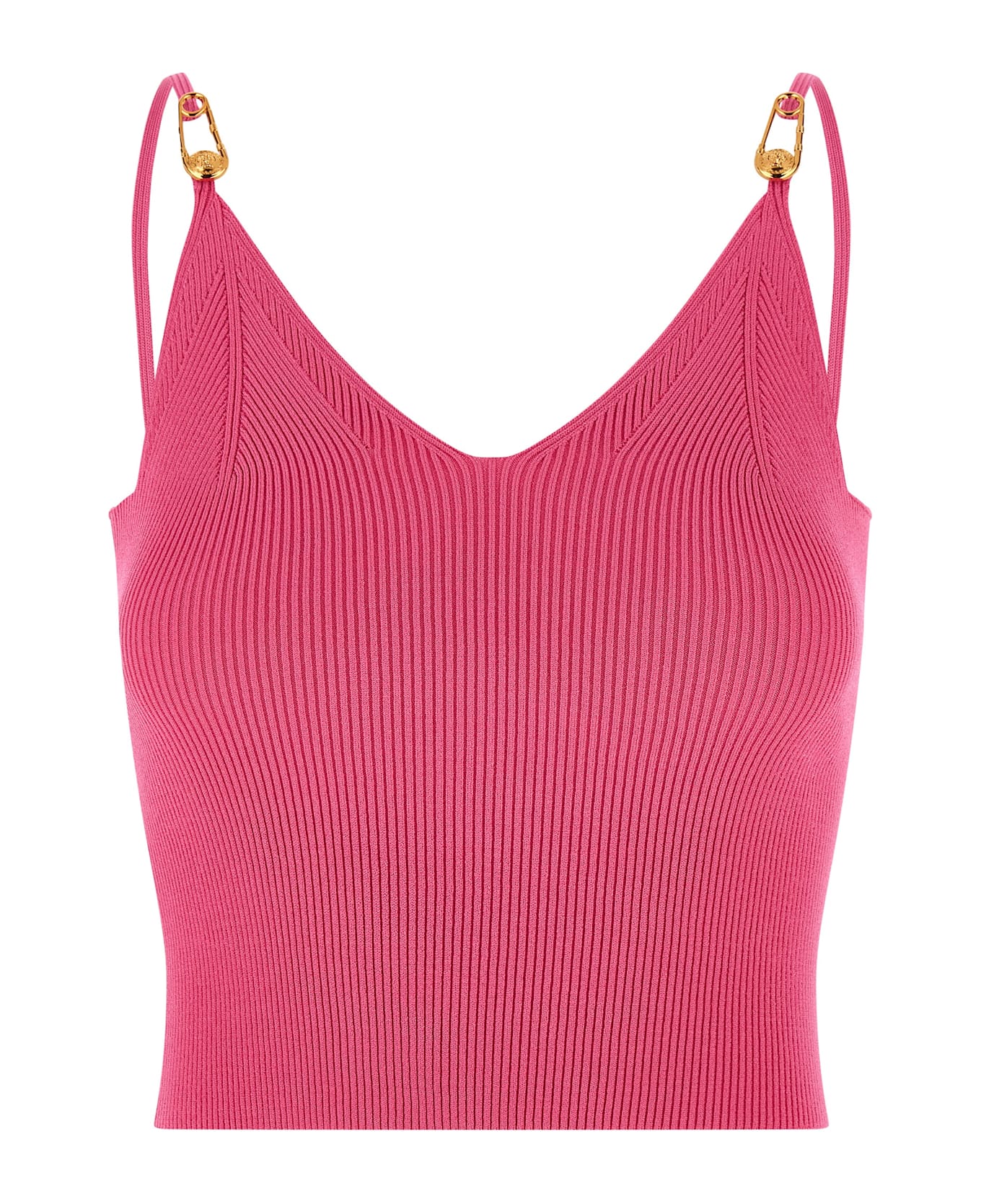 Stretch ribbed knit crop top with V-neck, thin straps with metal 'Safety Pin' detail.