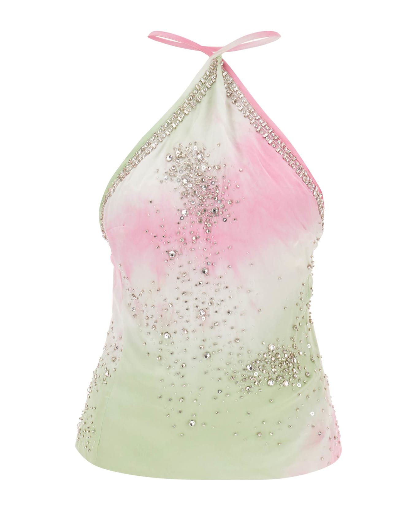 Des Phemmes top crafted in pure silk satin with tie-dye effect and crystal appliques all-over. Characterized by halterneck with spaghetti straps crossed at back, this garment features back invisible zipper and hook closure and interior lining. Slim fit. The model is 177 cm tall and wears size IT 40.