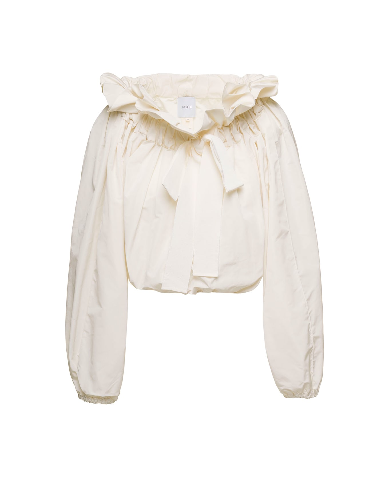 Blouse Adjustable drawstring neck Rouches detailing on the neck Long puff sleeves Elasticated edges Beige Polyester Relaxed fit