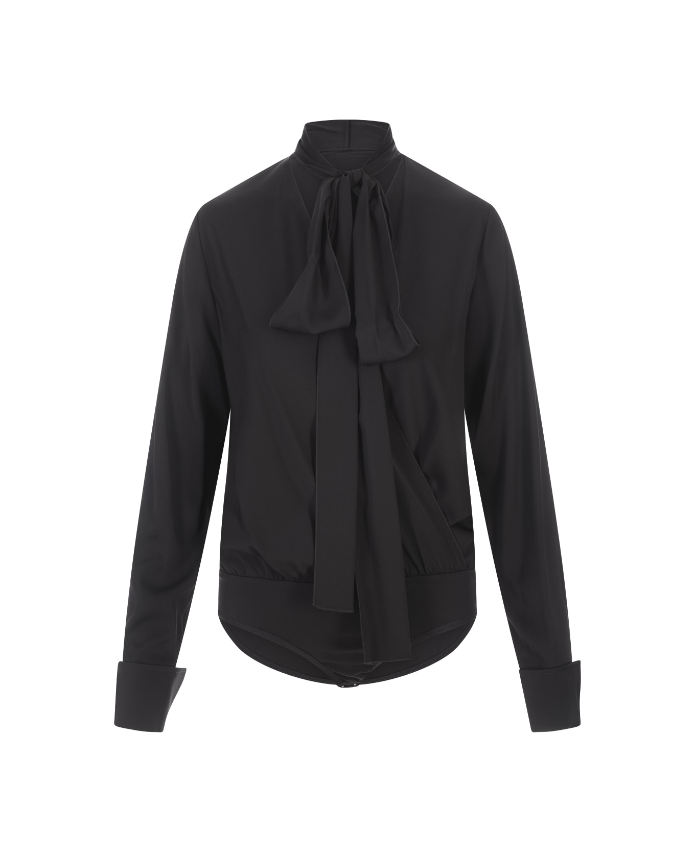 Black Moretto shirt by Sportmax made of stretch silk featuring a lavalliere collar, long sleeves, a curved hem and a front button fastening.