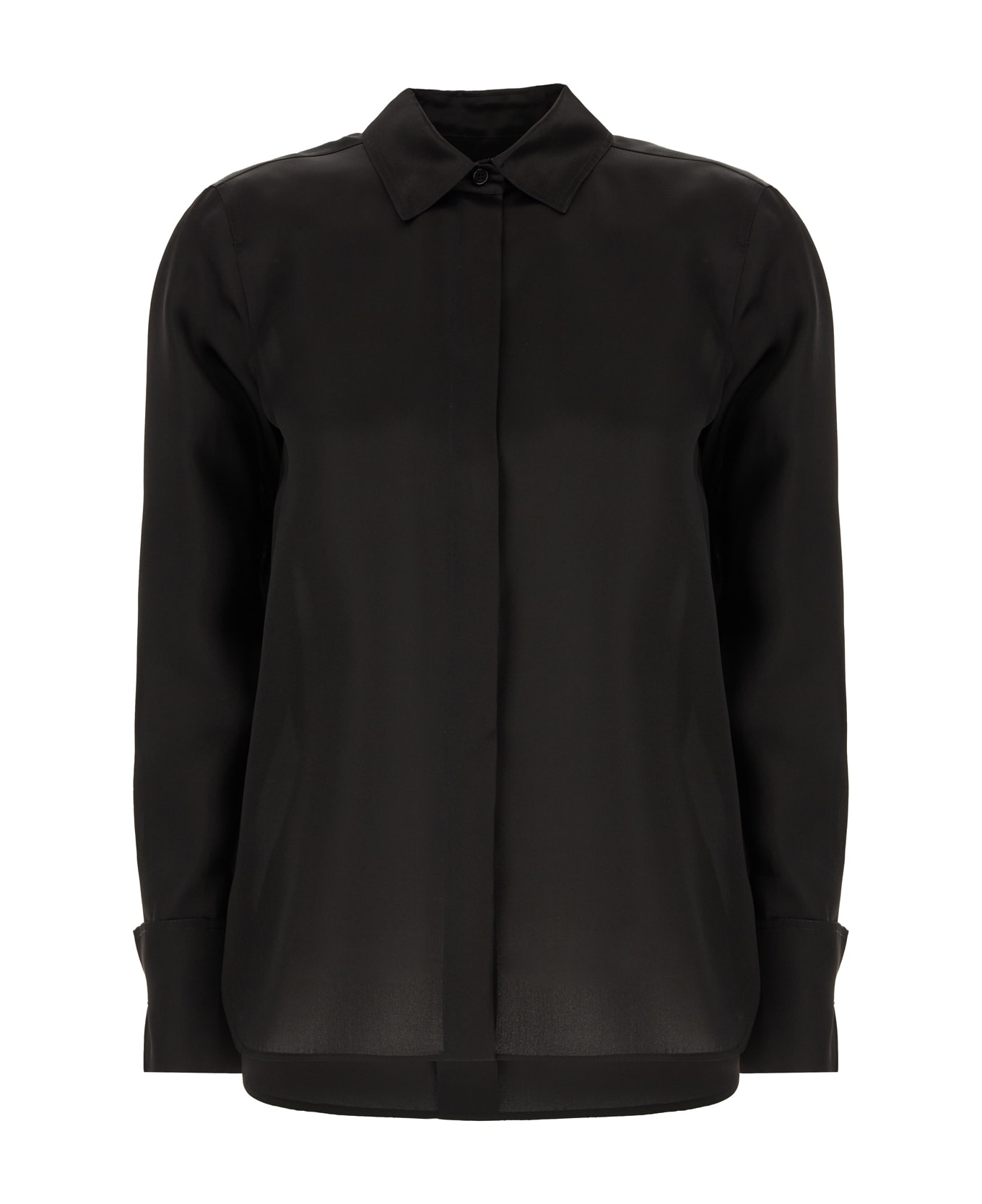 Shirt realized in pure silk. -Spread collar -Concealed buttons with a single visible button closure -French cuffs -Rear yoke and placket -Rounded hemline -Lateral slits on the hemline