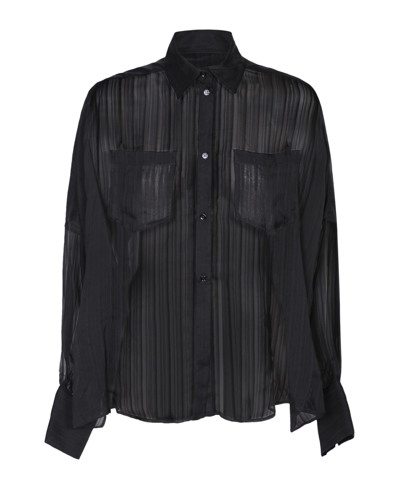 The REV shirt features a sophisticated design with silk organza fabric that offers elegant transparency. Crafted with a pointed collar and asymmetric hem, it's ideal for distinctive evening looks.