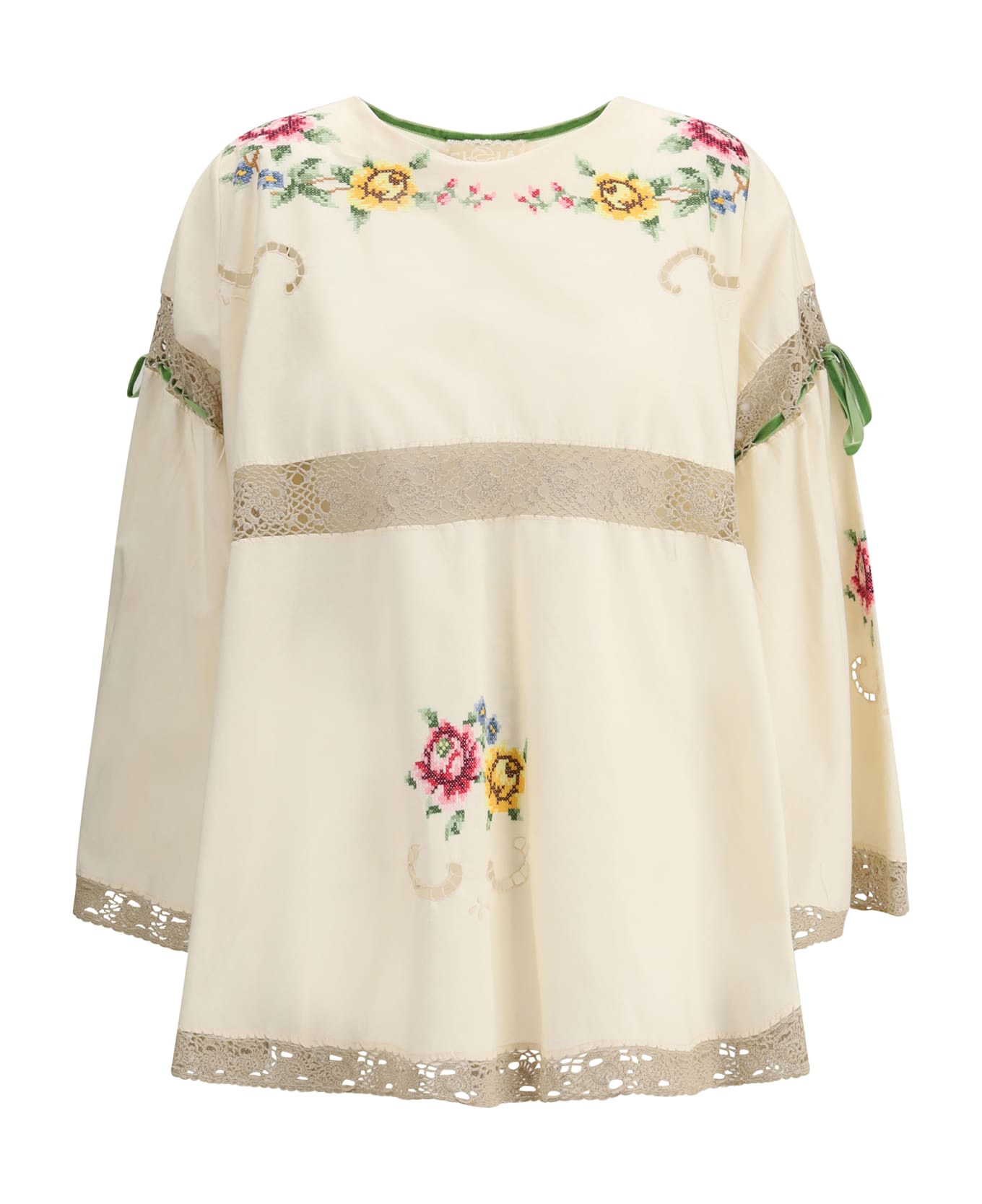 Ella's cotton blouse is a versatile and refined garment featuring a simple crew neck that enhances its clean, sophisticated silhouette. the long sleeves are embellished with velvet ribbons that add a touch of understated elegance. the asymmetric hemline lends a modern note to the design, while the sangallo lace details and floral motifs made with cross-stitch recall a traditional art, enriching the garment with delicate workmanship. perfect for a casual-chic look or for pairing with a smart jacket, this blouse combines comfort and style flawlessly.