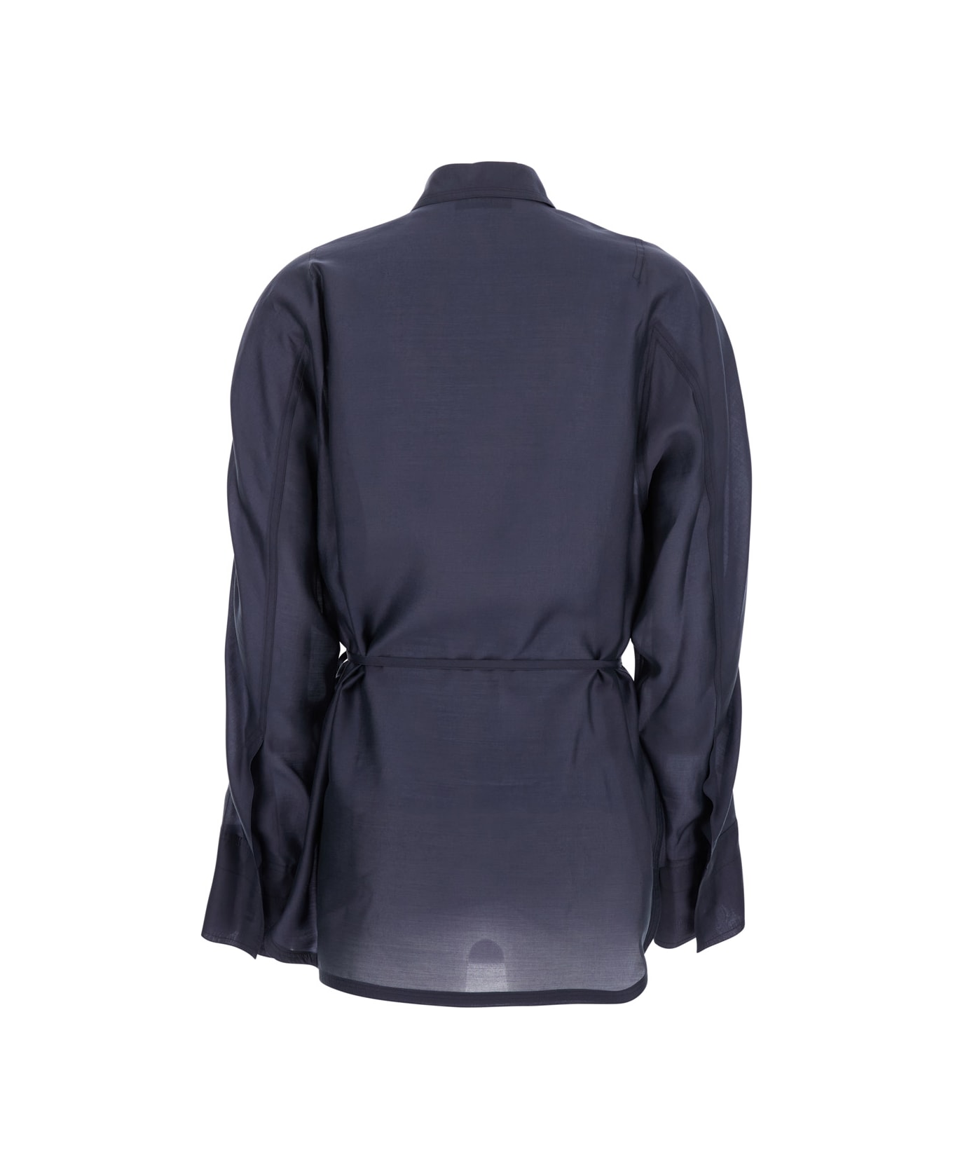 Shirt Blue Classic collar Long wide sleeves Front concealed button closure Belt detail on the waist Straight hem See-through design Tech fabric Regular fit