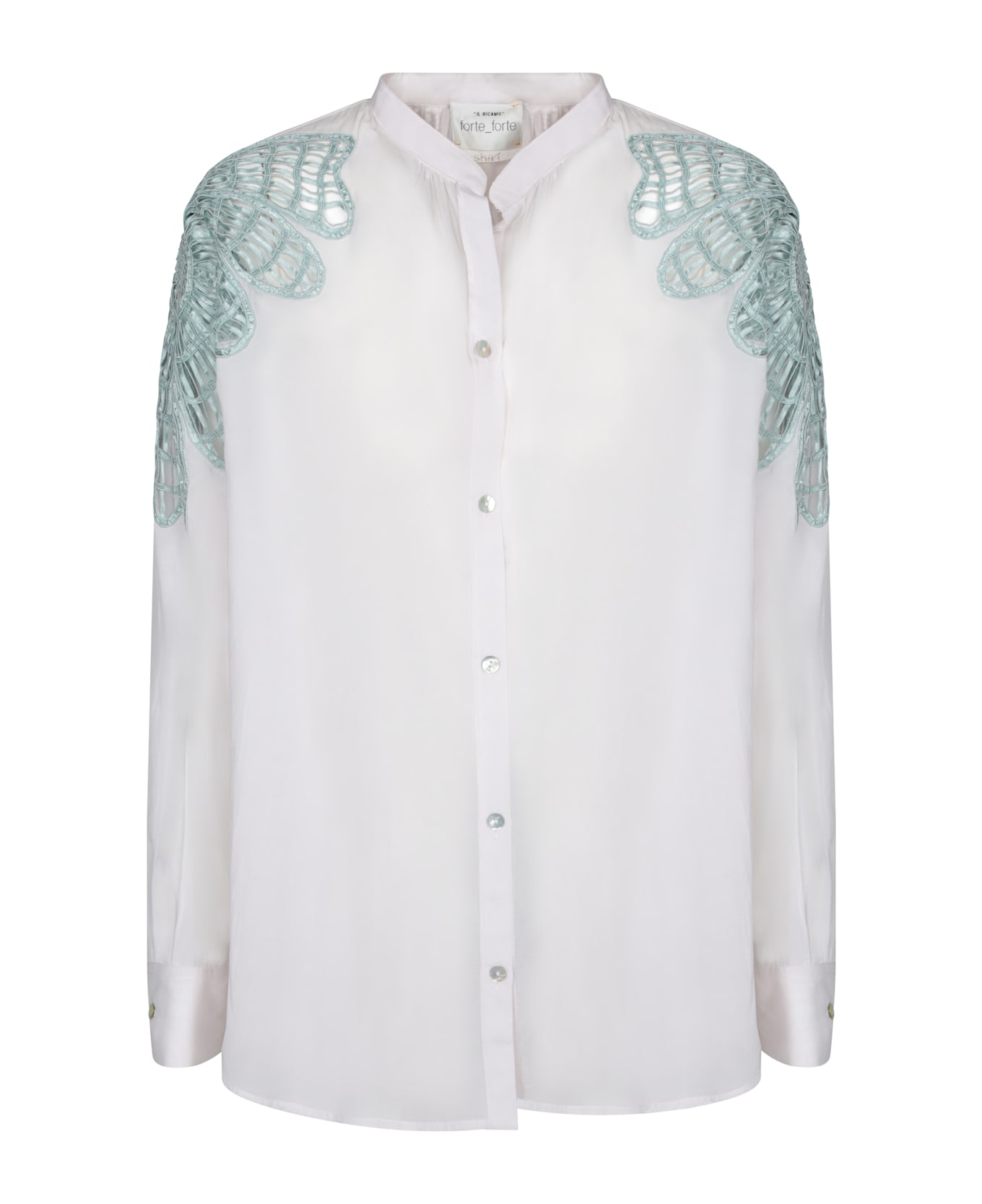 This elegant shirt by FORTE FORTE, crafted in delicate white voile, features light blue filigree embroidery on the shoulders, adding a touch of bohemian sophistication.