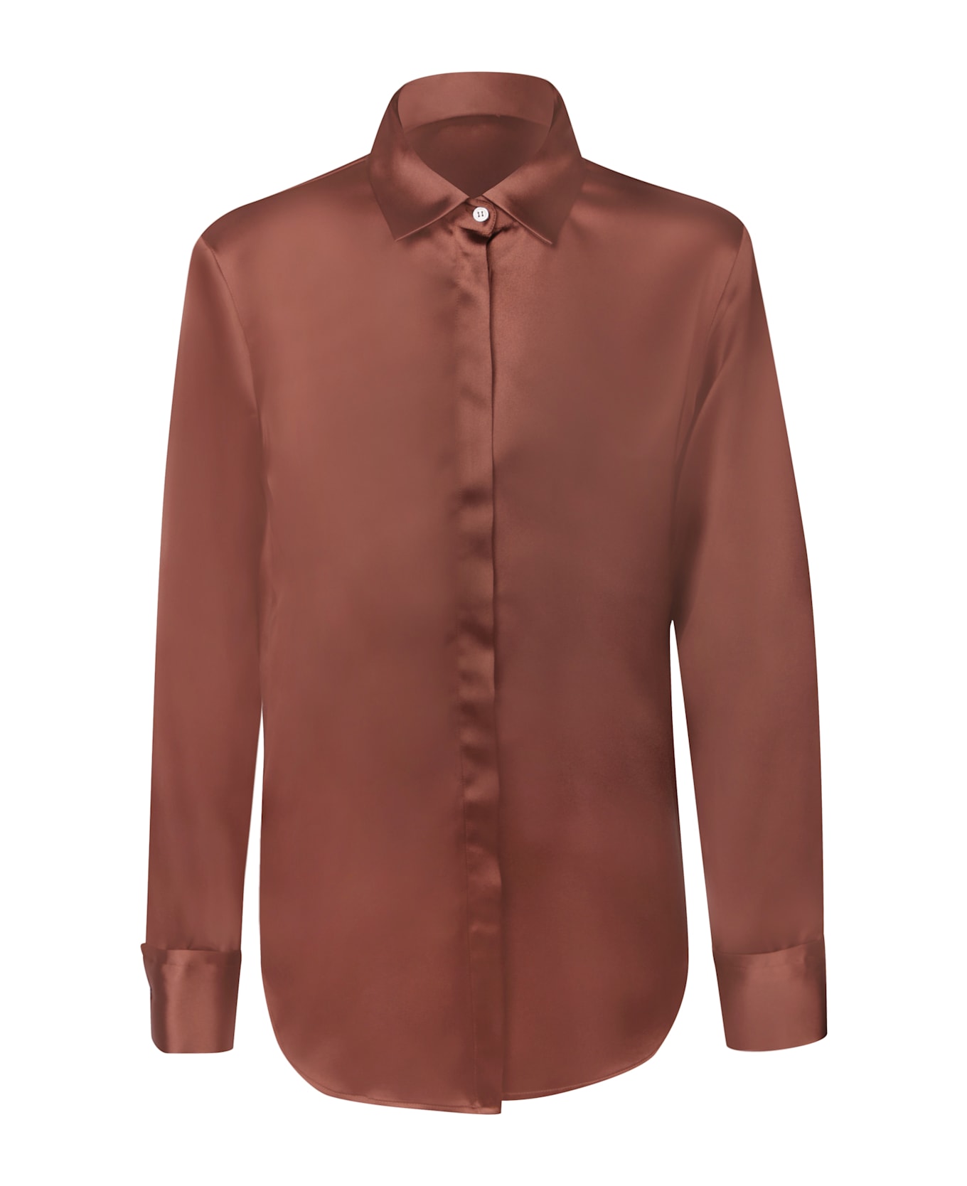 Classic collar. Front button fastening. Long sleeves. Buttoned cuffs. Tonal stitching. Regular fit. Straight hem. Color: brown