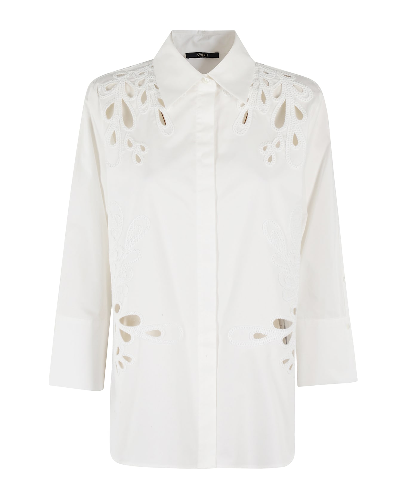 Shirt - Seventy - White color - Plain cotton canvas fabric - Floral cut-out embroidery - Pointed collar - Wide long sleeve with cuff and buttons - Concealed front button closure - Loose fit
