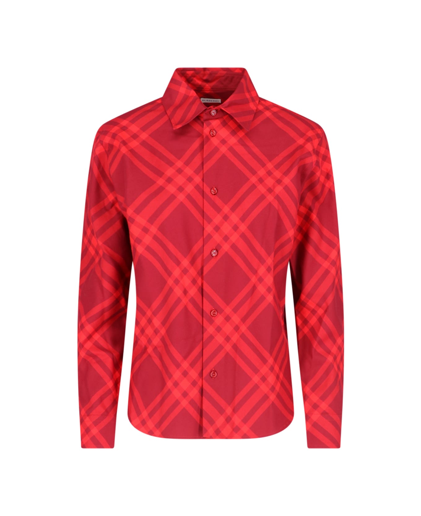 Burberry 'Check' red cotton shirt with iconic all-over logo pattern, classic collar, button closure, button cuffs, curved hem. Composition: 100% Cotton