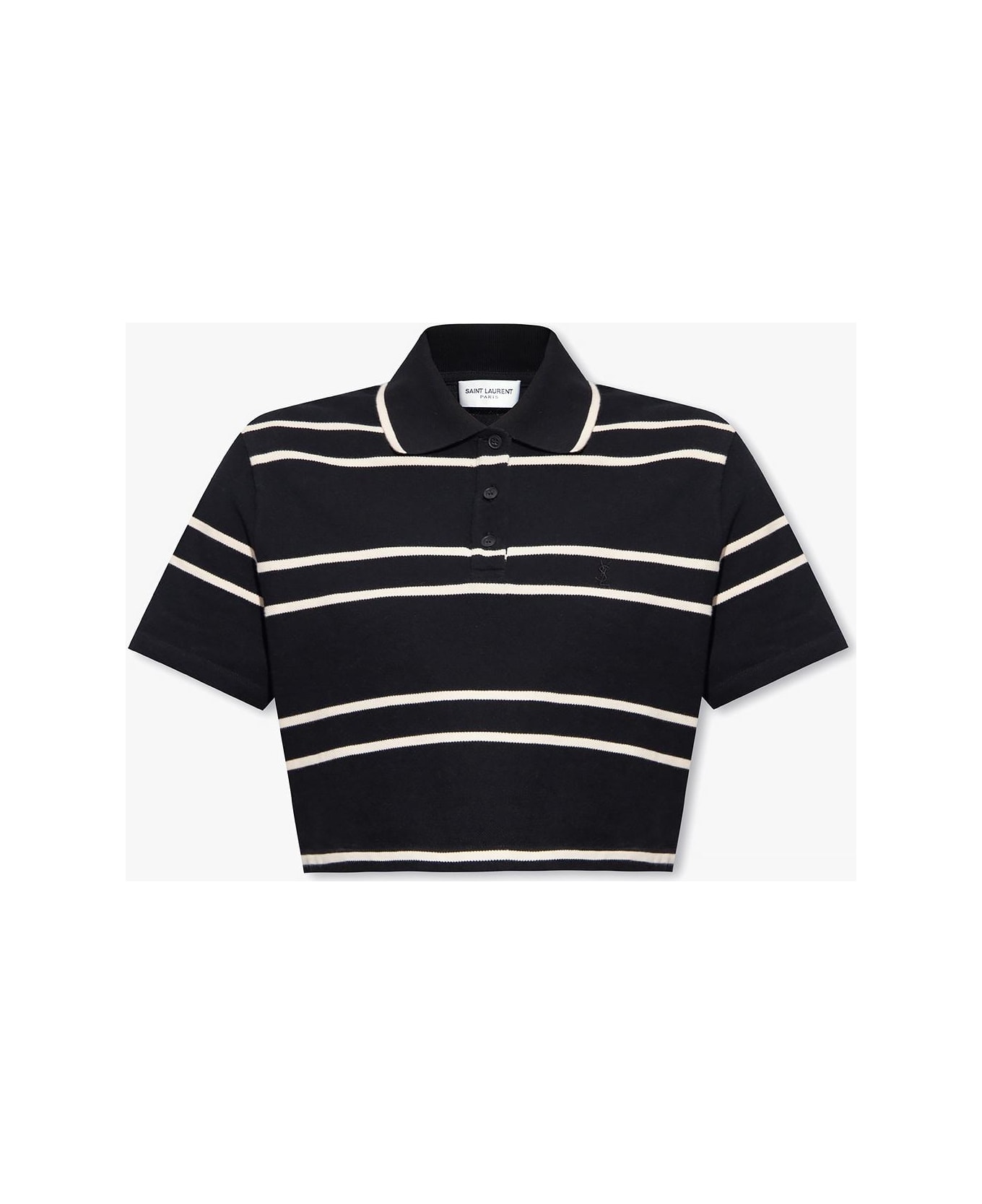 Black and beige polo shirt from Saint Laurent. Made of cotton with a cropped fit, this style showcases a stripe pattern. It is complete with a button placket, short sleeves and logo embroidery on the front. Composition: 100% Cotton