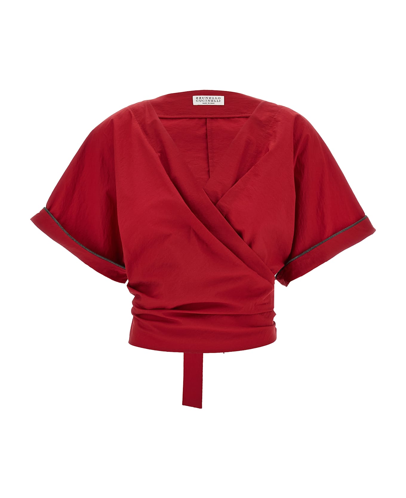 Cotton blend shirt, V-neck, crossed model with adjustable side buckle at the waist, short and wide sleeves. Composition: 75% copa%