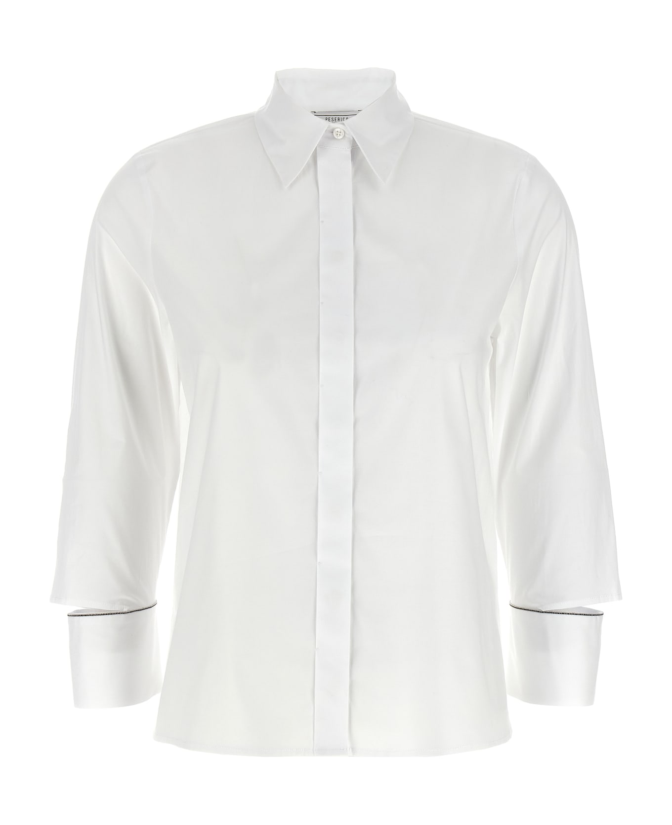 Stretch cotton solid poplin shirt, front concealed button closure, long cuffed sleeves, metal detail cuffs and partial cut-out, side slits. Composition: 97% cotton, 3% elastane