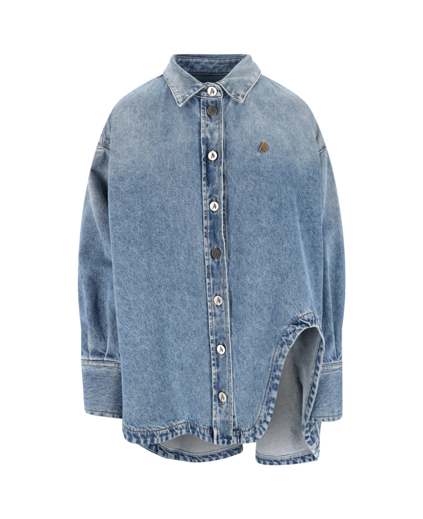 The Attico light blue cotton denim shirt with classic collar, long sleeves, front button closure, logo embroidery on the front, side split detail, straight hem. Composition: 100% Cotton