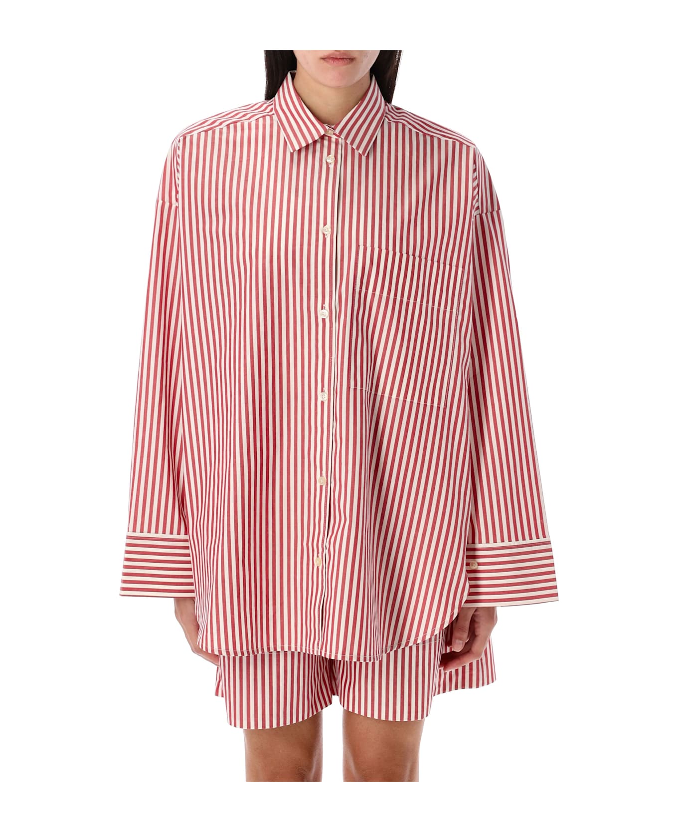 Derris Organic Cotton Striped Shirt By By Marlene Birger. Featuring: Point Collar Buttons Fastening Buttoned Cuffs Chest Patch Pocket Stripes Pattern Curved Hemline Oversized Fit Model Is 1,70 M And Wears Size 34
