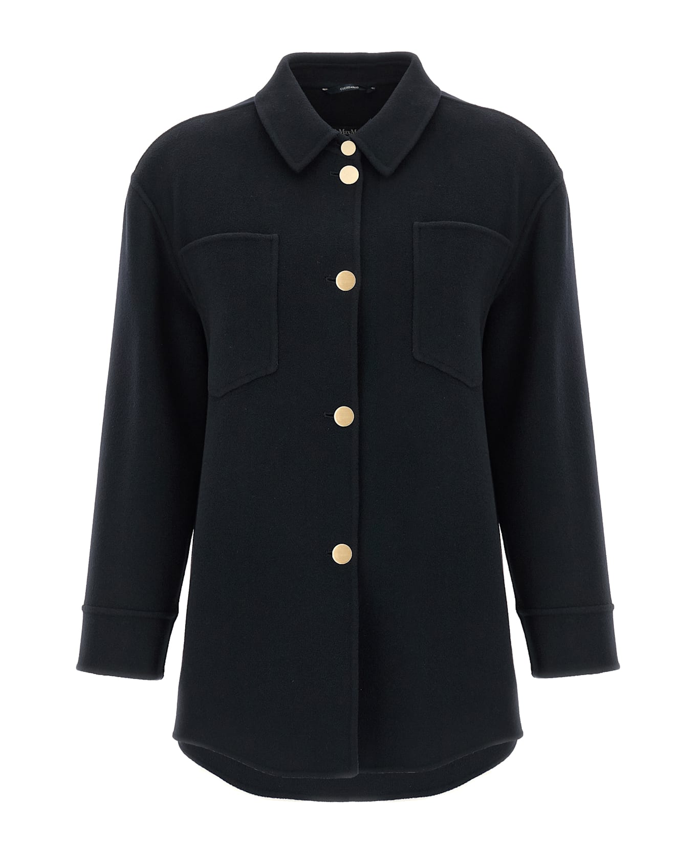'Eleonora' shirt in double pure wool drap sewn by hand, front metal button closure, pockets, long sleeves with dropped shoulders. Composition: 100% virgin wool