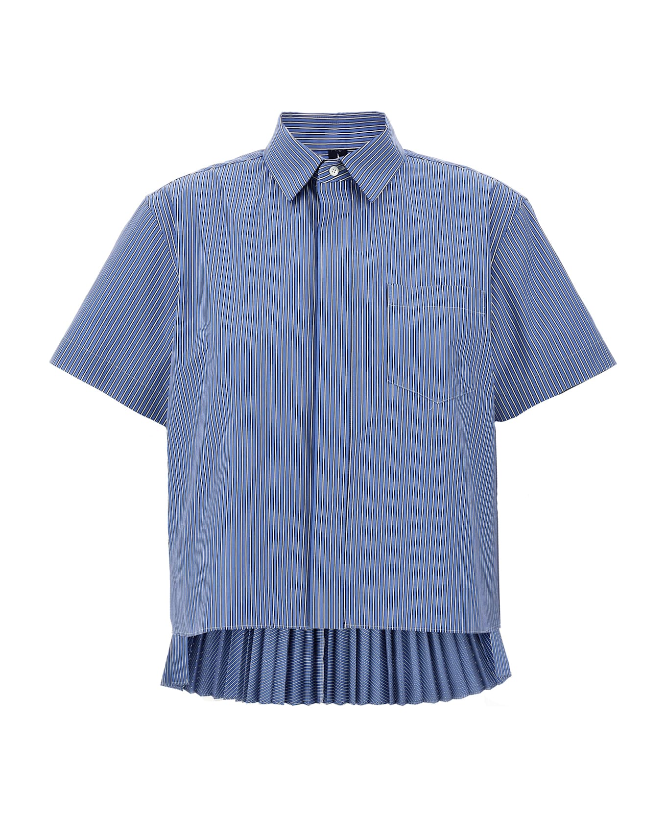 Striped cotton poplin shirt, chest pocket, button closure, short sleeves, crop style with back opening with asymmetric flounced insert.