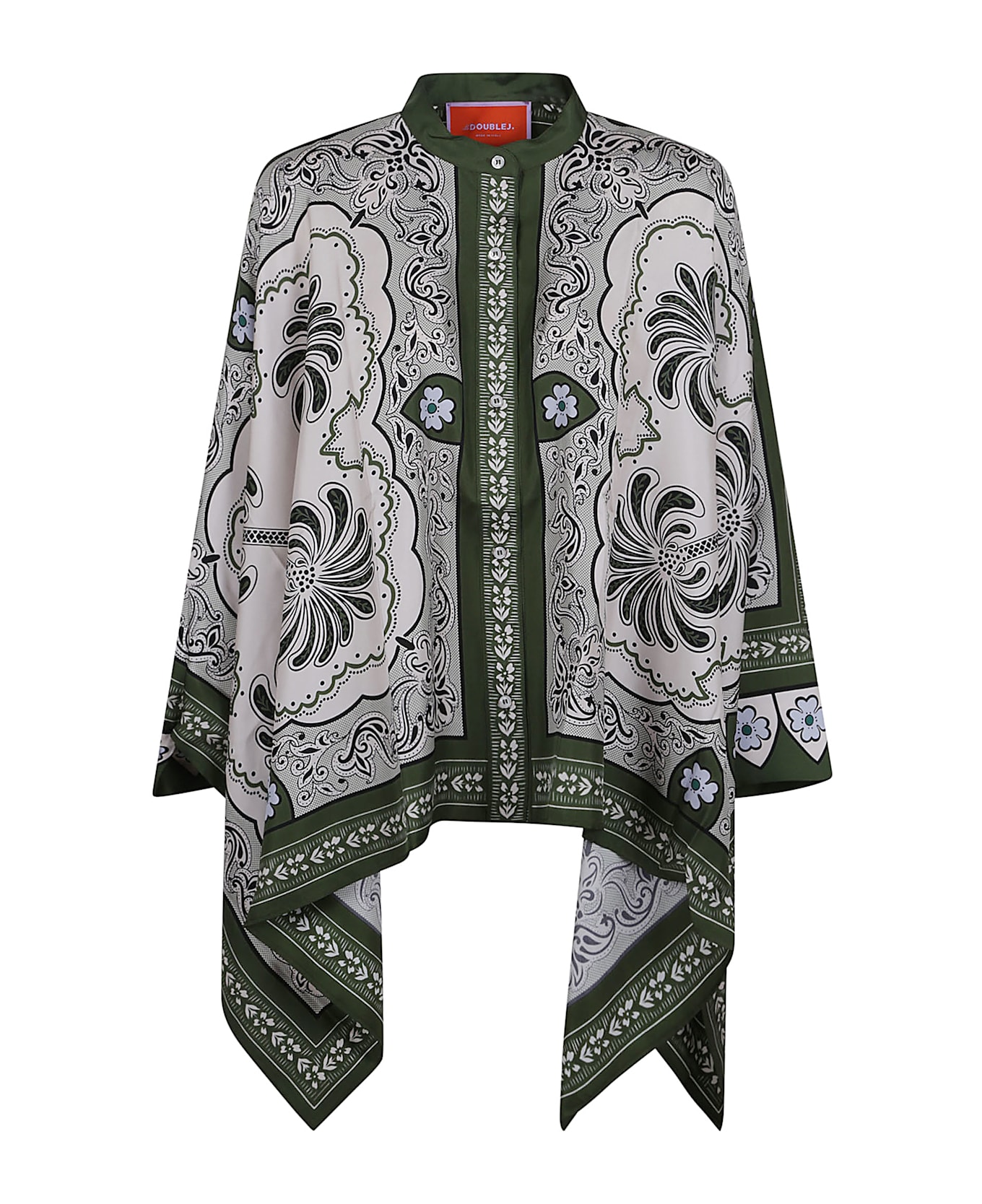 classic caftan shirt model la double j in white silk with black and green print covered buttons on the front that can be combined with its trousers.