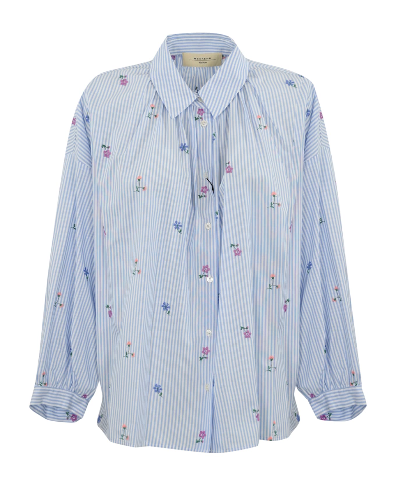 women's cotton shirt: cotton poplin long puff sleeves collar front button closure gathered details all-over embroidery dropped shoulder boxy fit composition: 100% cotton