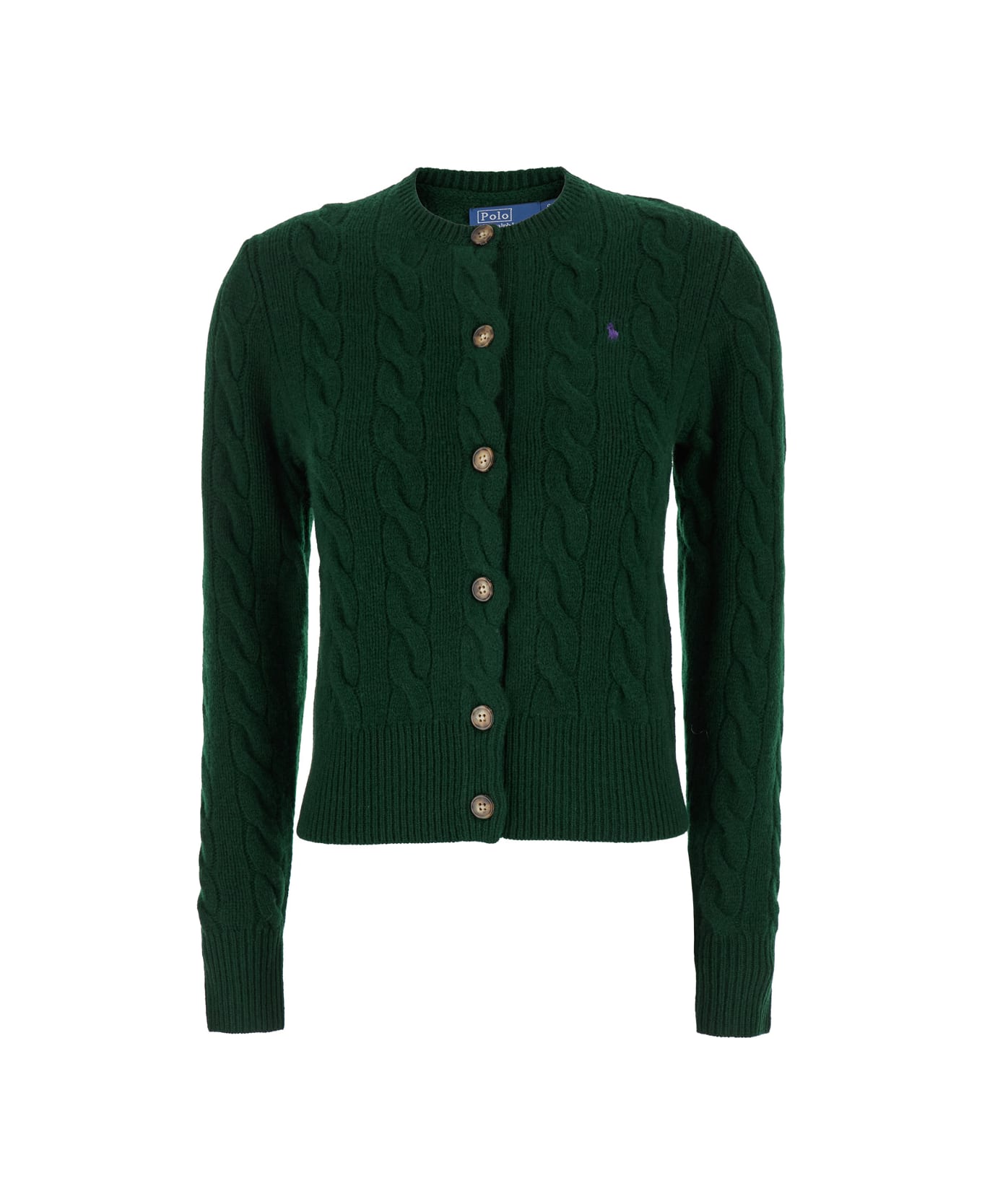 Cardigan Green Crewneck Long sleeves with cuffs Front button closure Cable knit Pony embroidery at the front Ribbed trim Cropped style Wool Regular fit