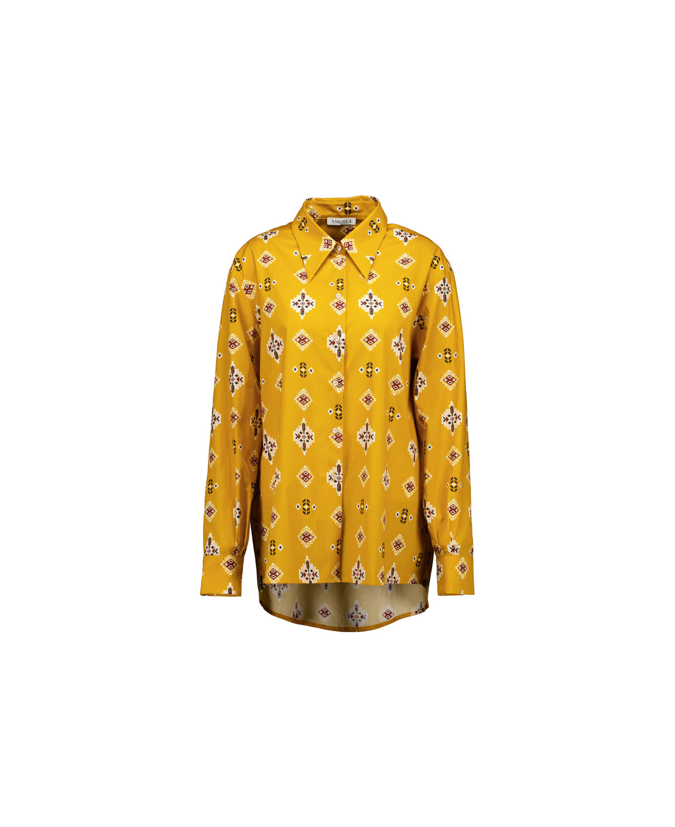 Signature Amotea's shirt Kaia in light ecru wool. The model boasts an oversized line and pointed collar.