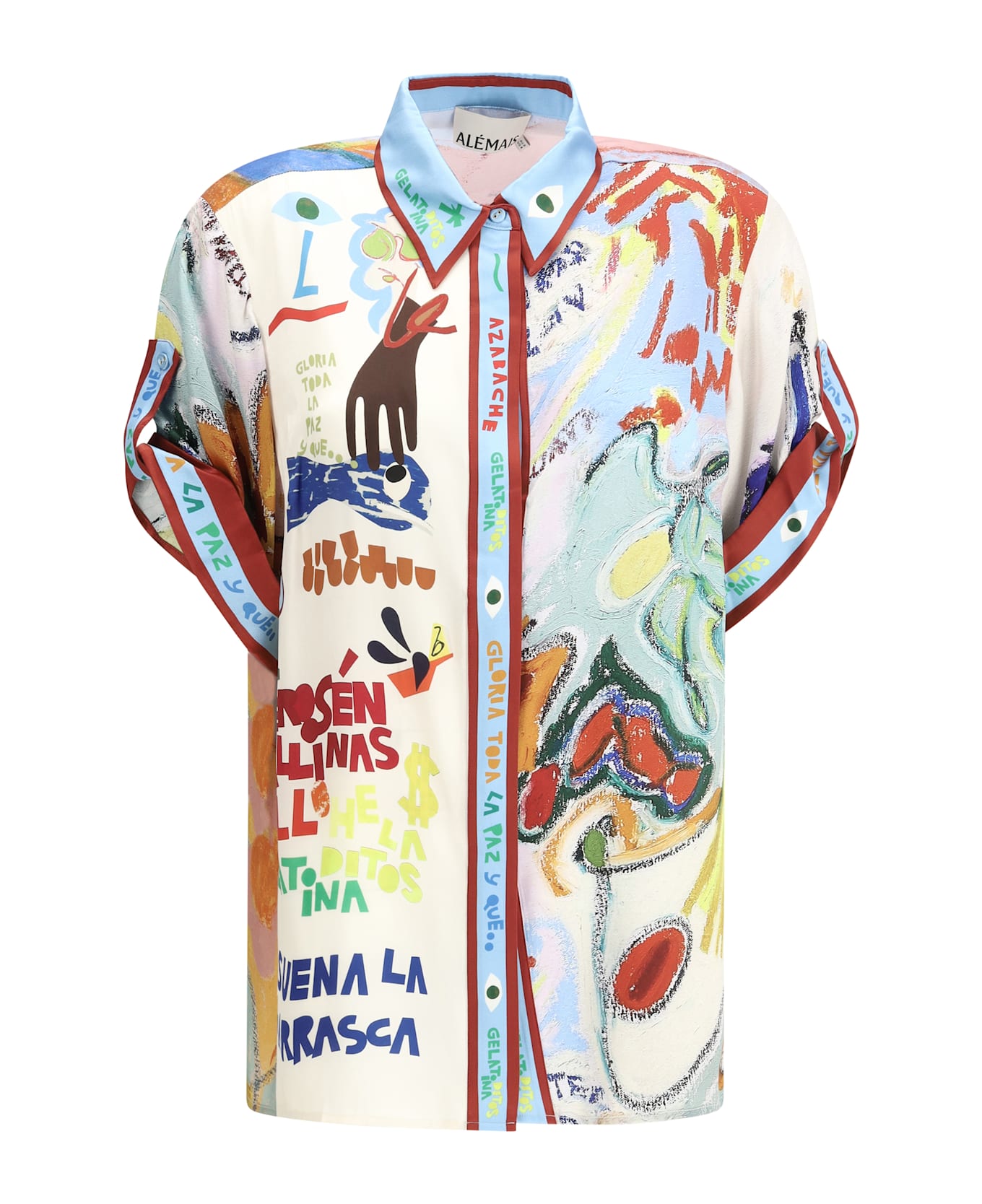La charrasca silk shirt by alémais, short-sleeved design, classic collar, front button closure, multicolored pattern, loose fit.
