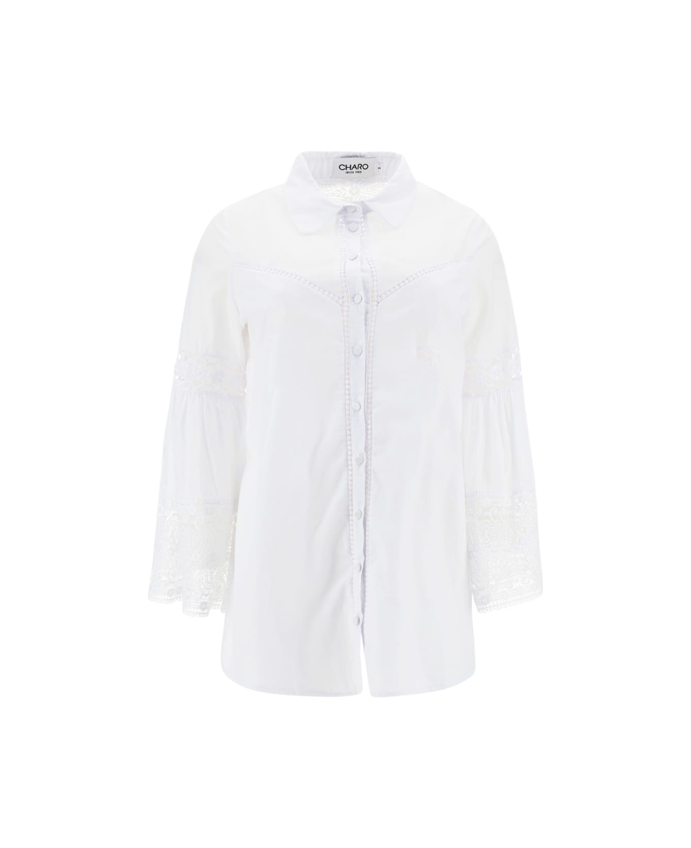 Cotton letta shirt by charo ruiz, classic collar, a front button fastening, wide bell sleeves with a floral lace design, wide side slits, a lace detail on the back, a semi-transparent monochrome pattern, a flared hem, and an oversized fit.