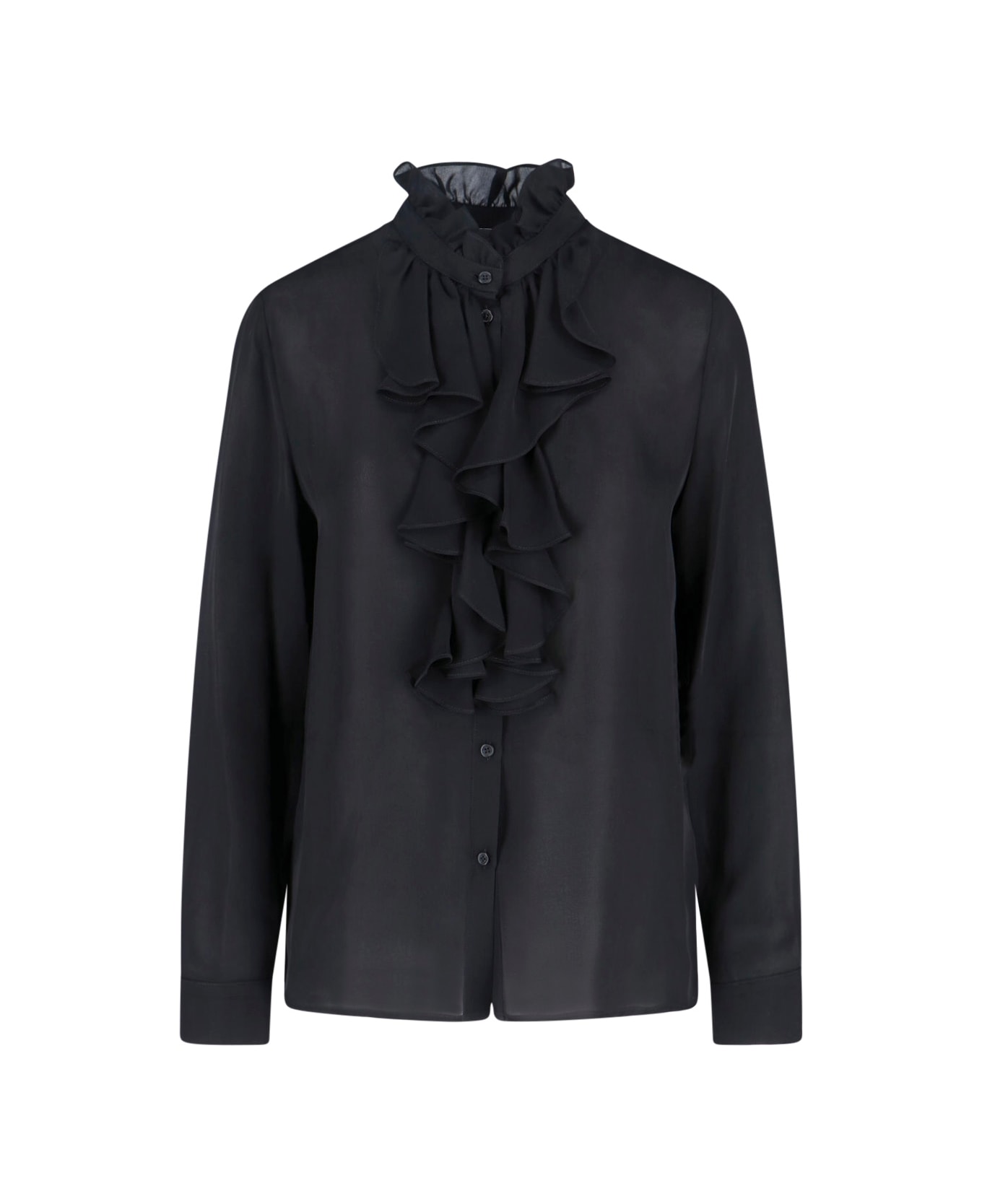 Nili Lotan 'lily' black silk shirt with high neck, long sleeves, button closure, ruffle detail on the front, straight hem.