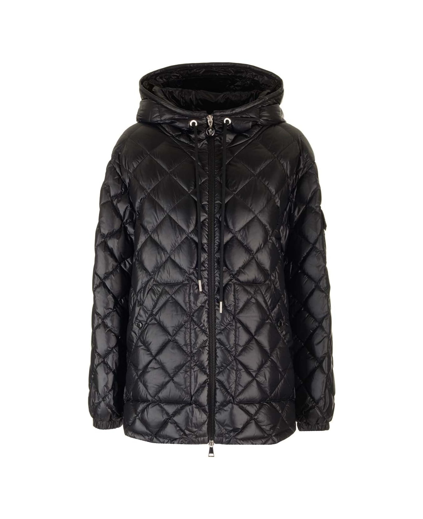 Long saison jacket in black nylon laquè from Moncler, with quilted motif, adjustable hood with drawstring, front zip, 3/4 length.