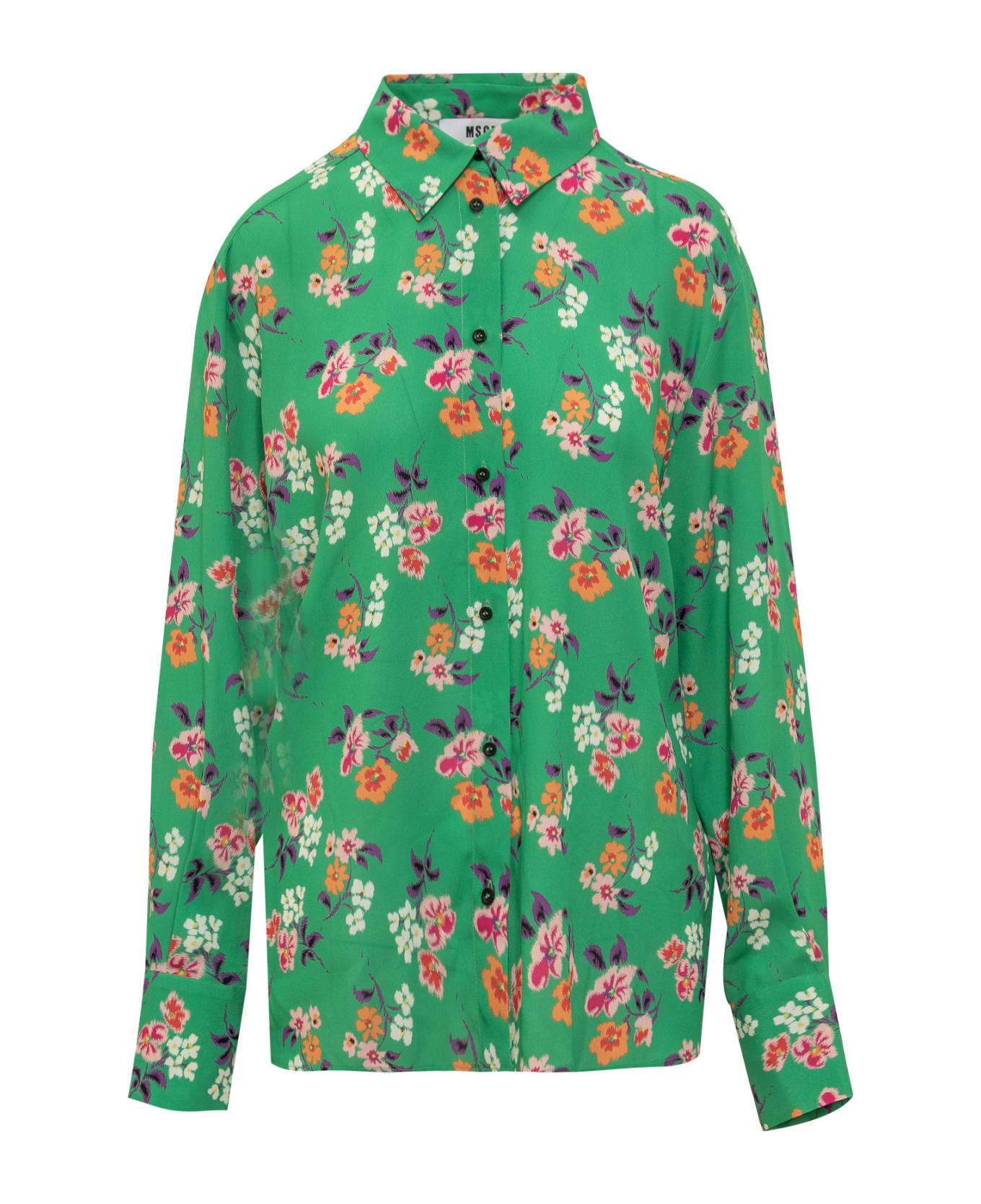 Long sleeve shirt. Classic collar. Button closure. Buttons on cuffs. All over floral pattern.