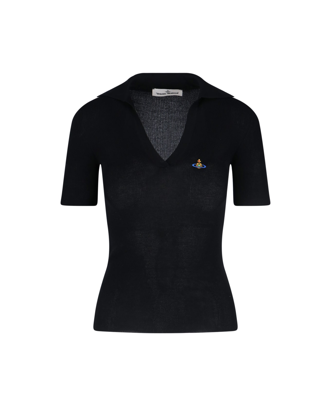 Vivienne Westwood 'Marina' knit polo shirt in black cotton with ribbed pattern, V-neck, short sleeves, multicolor 'Orb' logo embroidery, straight hem. Composition: 100% Cotton