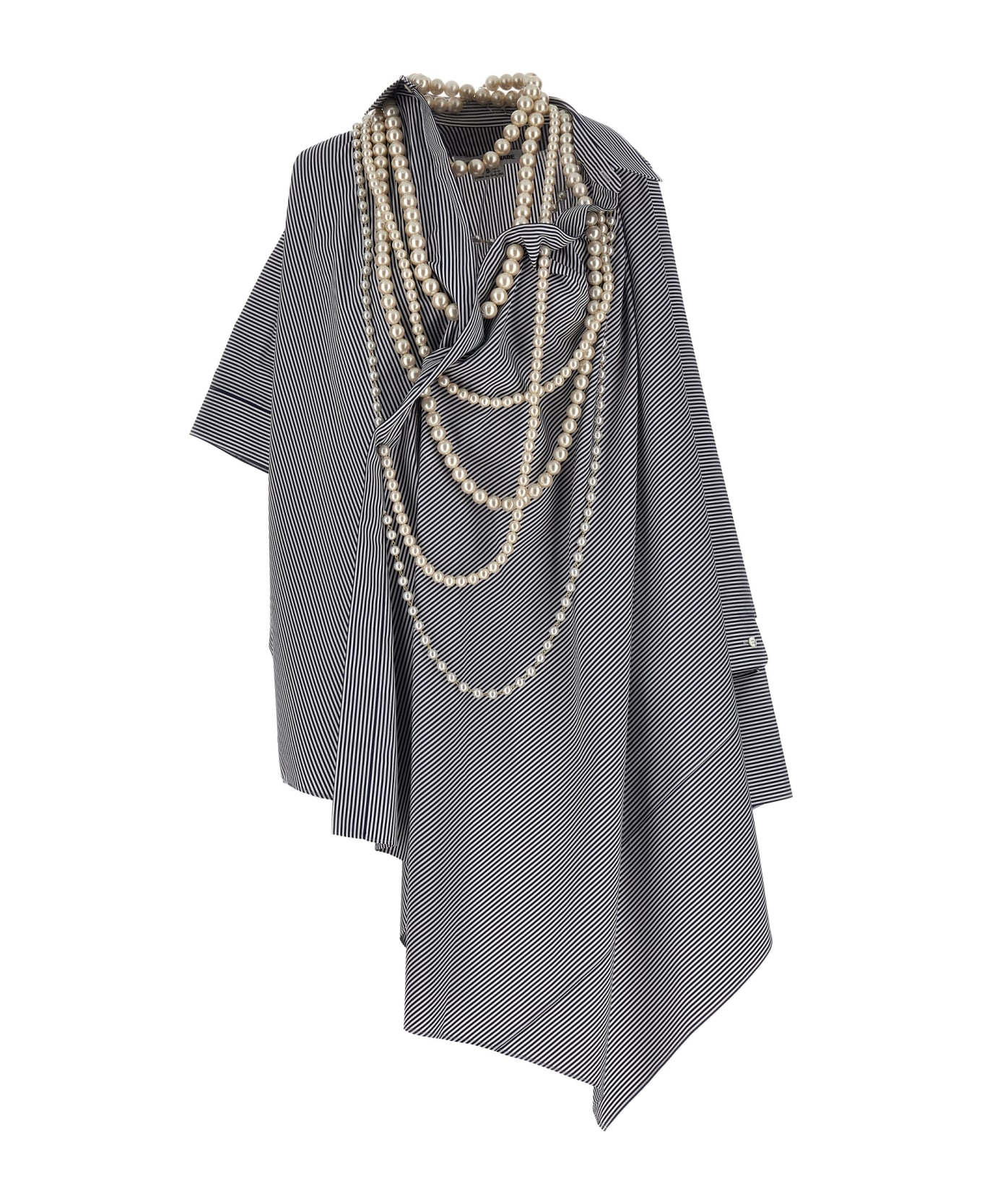 Oversize striped cotton shirt with pearl necklace appliqués, asymmetric style and wide sleeves.