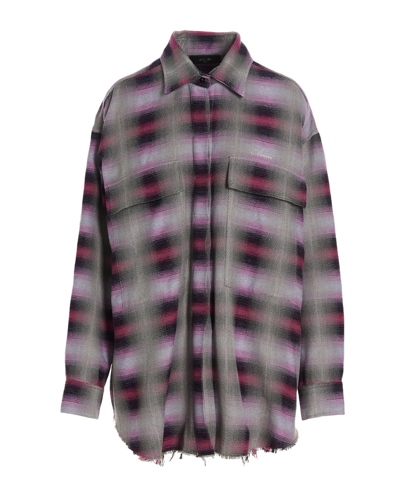 Oversized' wool blend shirt with a check print, a button closure, pockets, long cuffed sleeves, front logo embroidery and frayed hem.