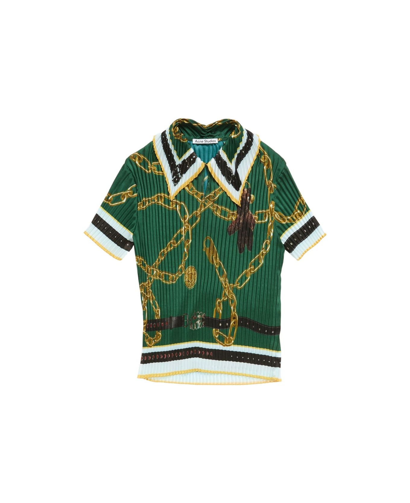 green chain print pleated short sleeves collared striped trim