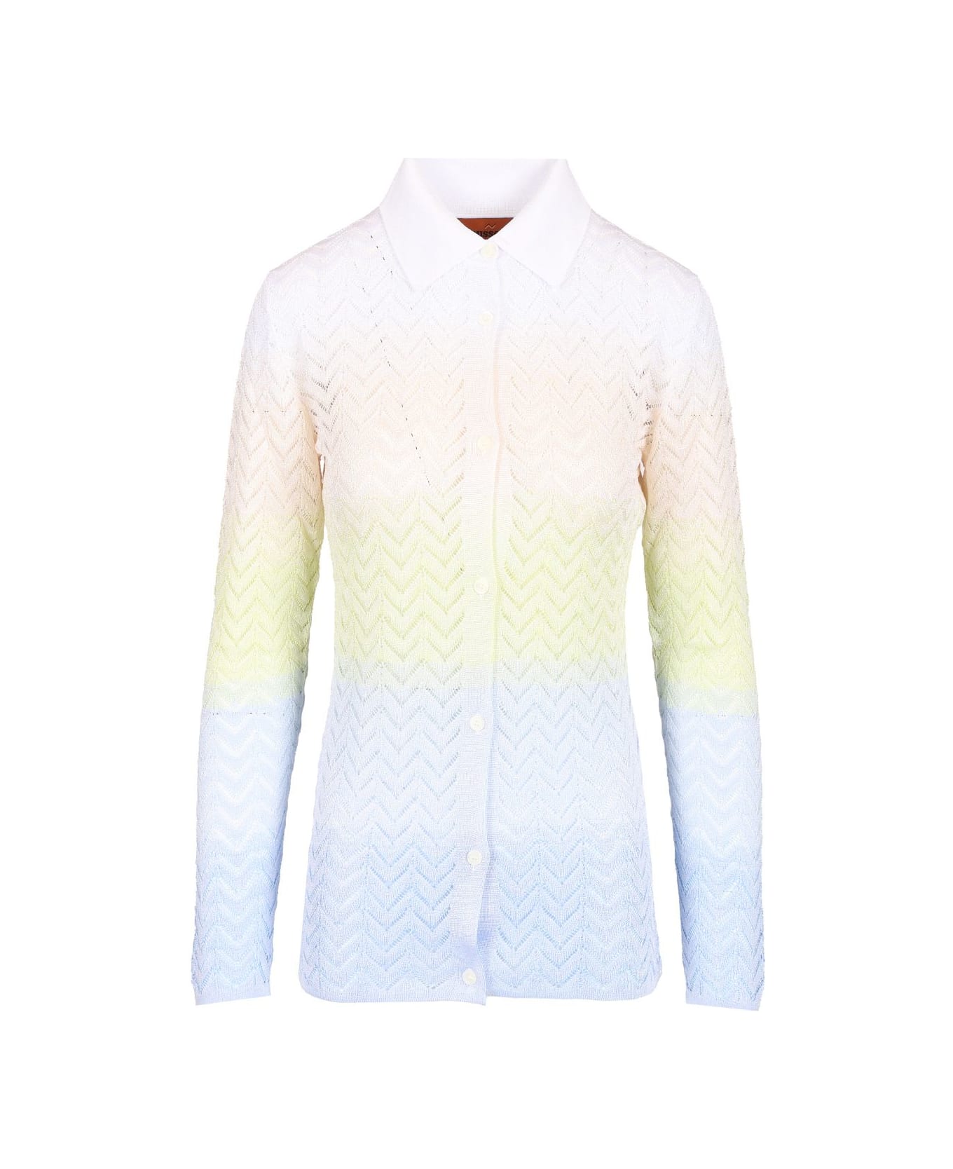 Rainbow shaded chevron viscose knit shirt by Missoni. Collar and button fastening on the front.