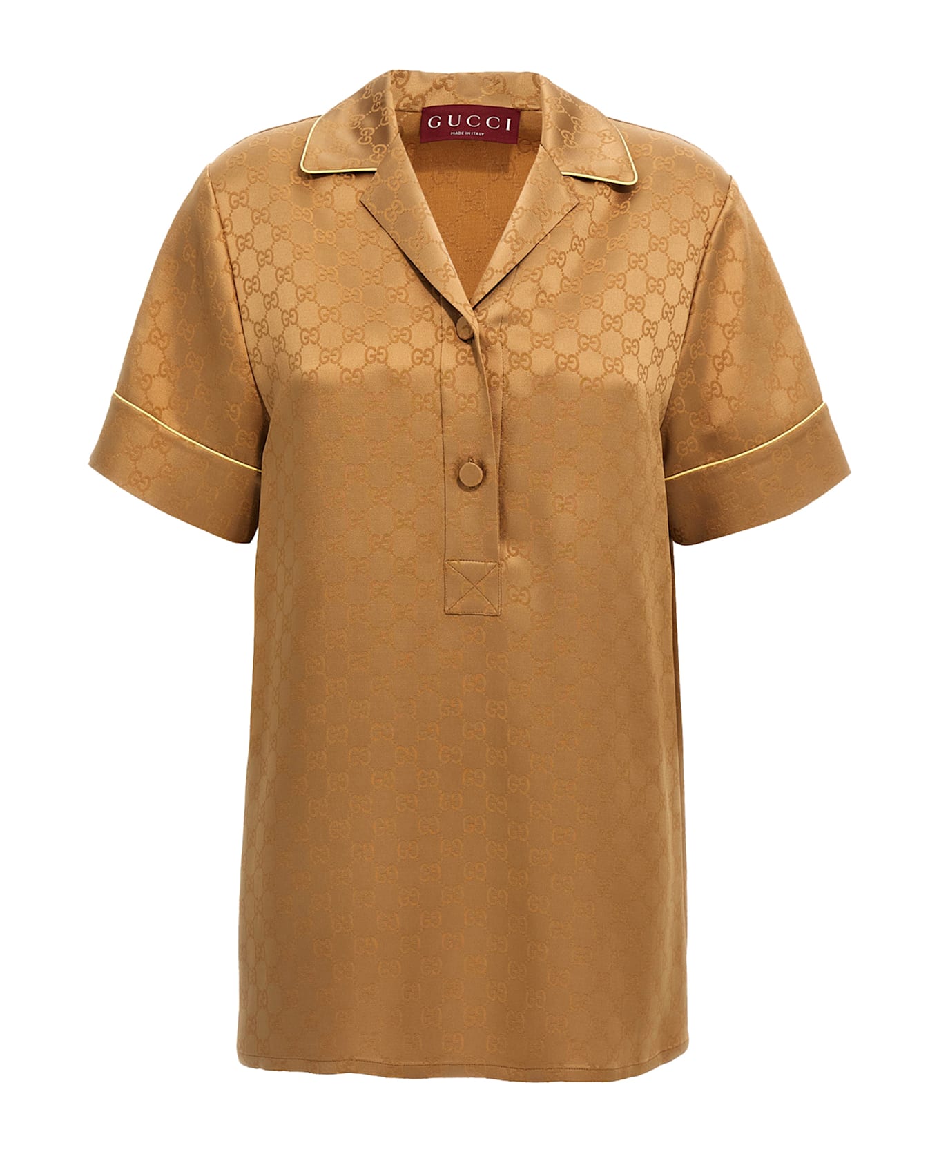 All-over GG monogramm satin shirt with solid color details, collar and buttons, short sleeves with dropped shoulders. Composition: 55% viscose, 45% acetate